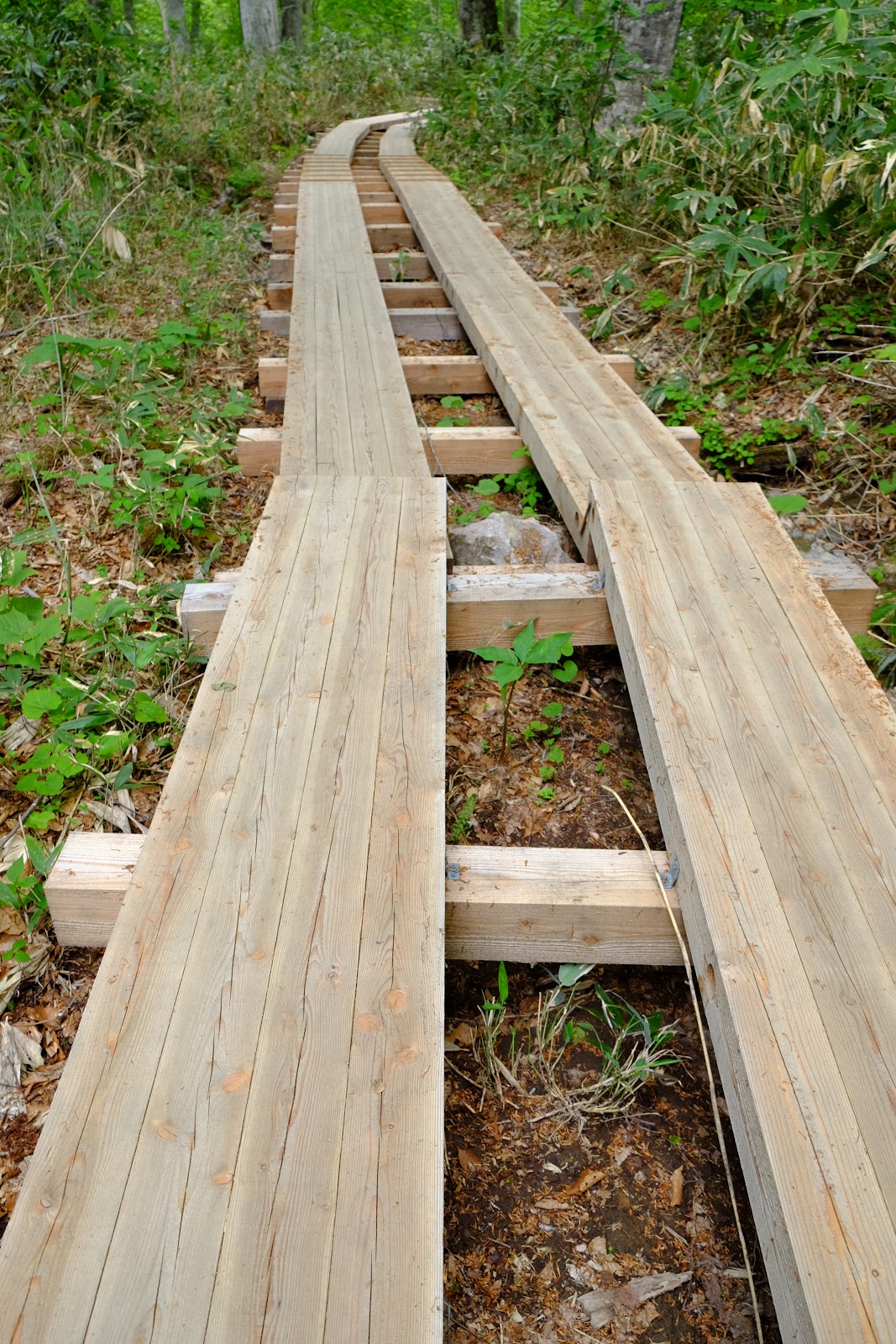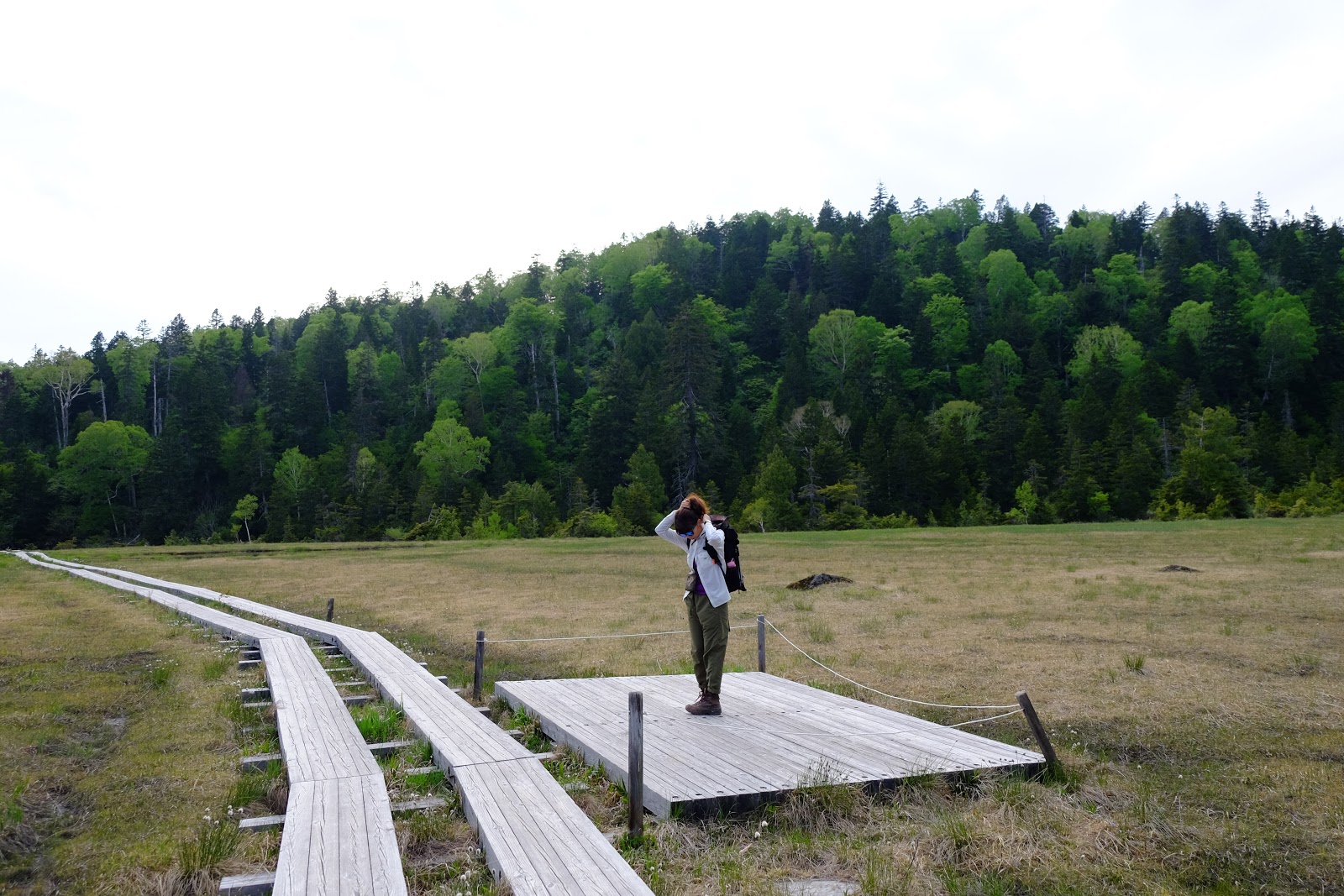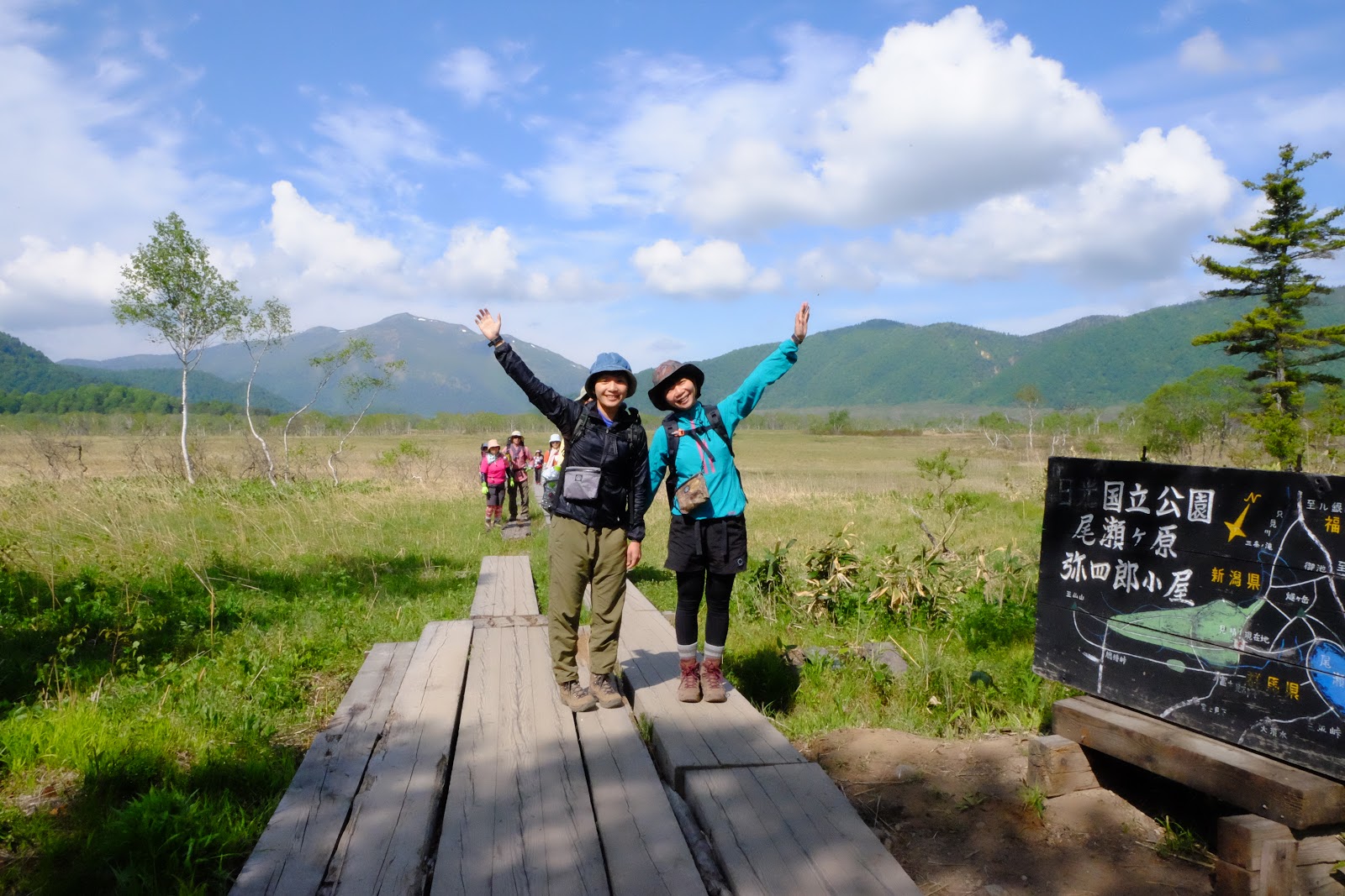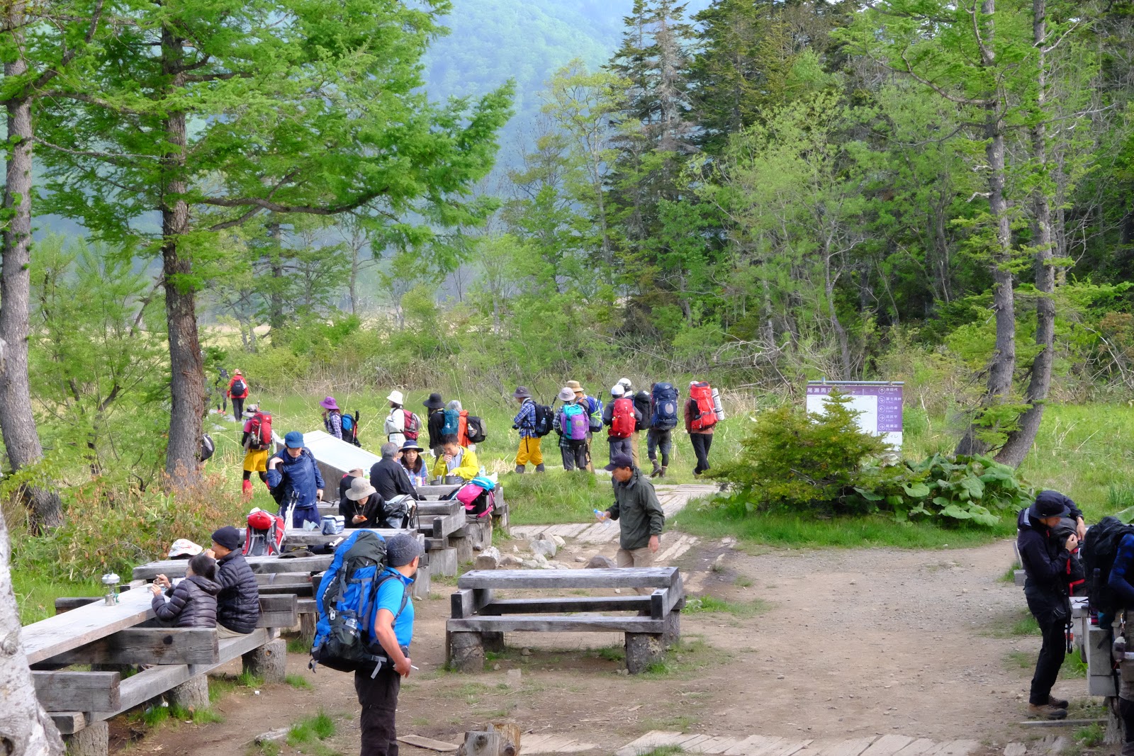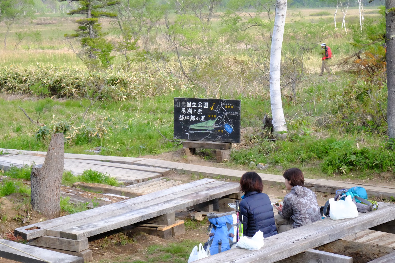 從燧之岳下山後開始進入尾瀬沼的淺湖濕原,海拔1600m的高山濕原分布在這個區域中,右邊是燧之岳左邊是高原,木棧道筆直分布其中,還有許多可以露營的棧板。中間有清涼的溪流,取水方便,雖然自然生態保育的非常好,但還是建議不要生飲,有過濾過比較好喔。