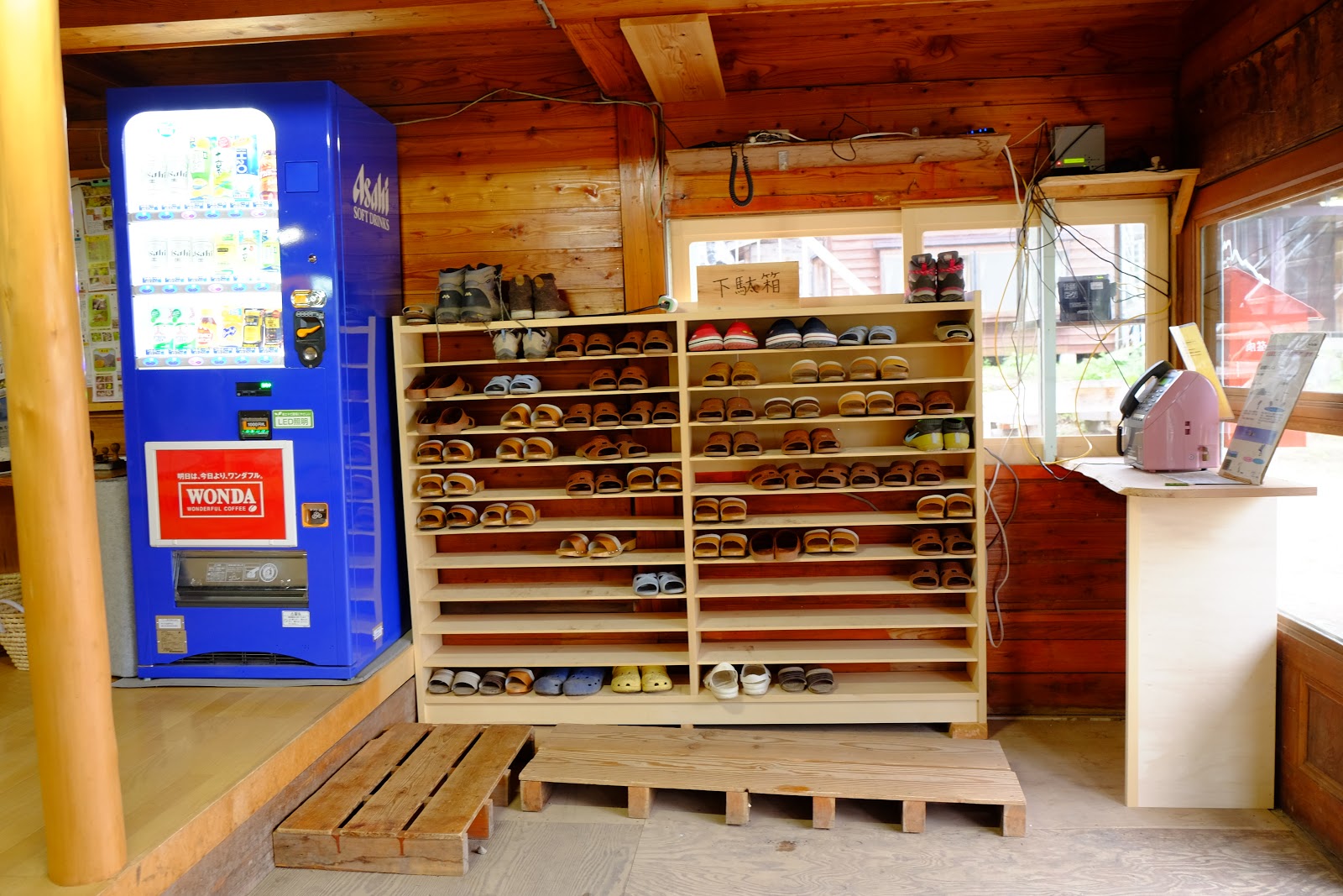 ↑受付處櫃台一旁有公佈欄可以查看車次與相關的資訊,亦有熱水可以自由使用。