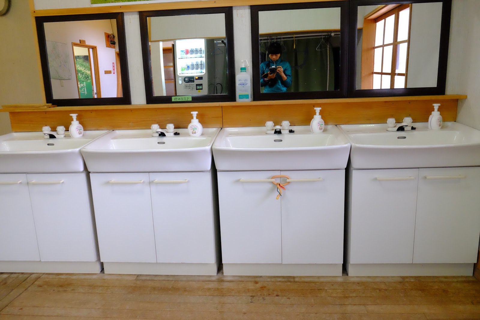 ↑別館盥洗洗手台在入口的地方,共有四個,大家會按照先後順序排隊。也要注意不要使用牙膏與洗面乳,若需要化妝、綁頭髮或是要進行保養程序,請另外回到自己的床鋪進行,盡量不要耽誤下一位的使用時間