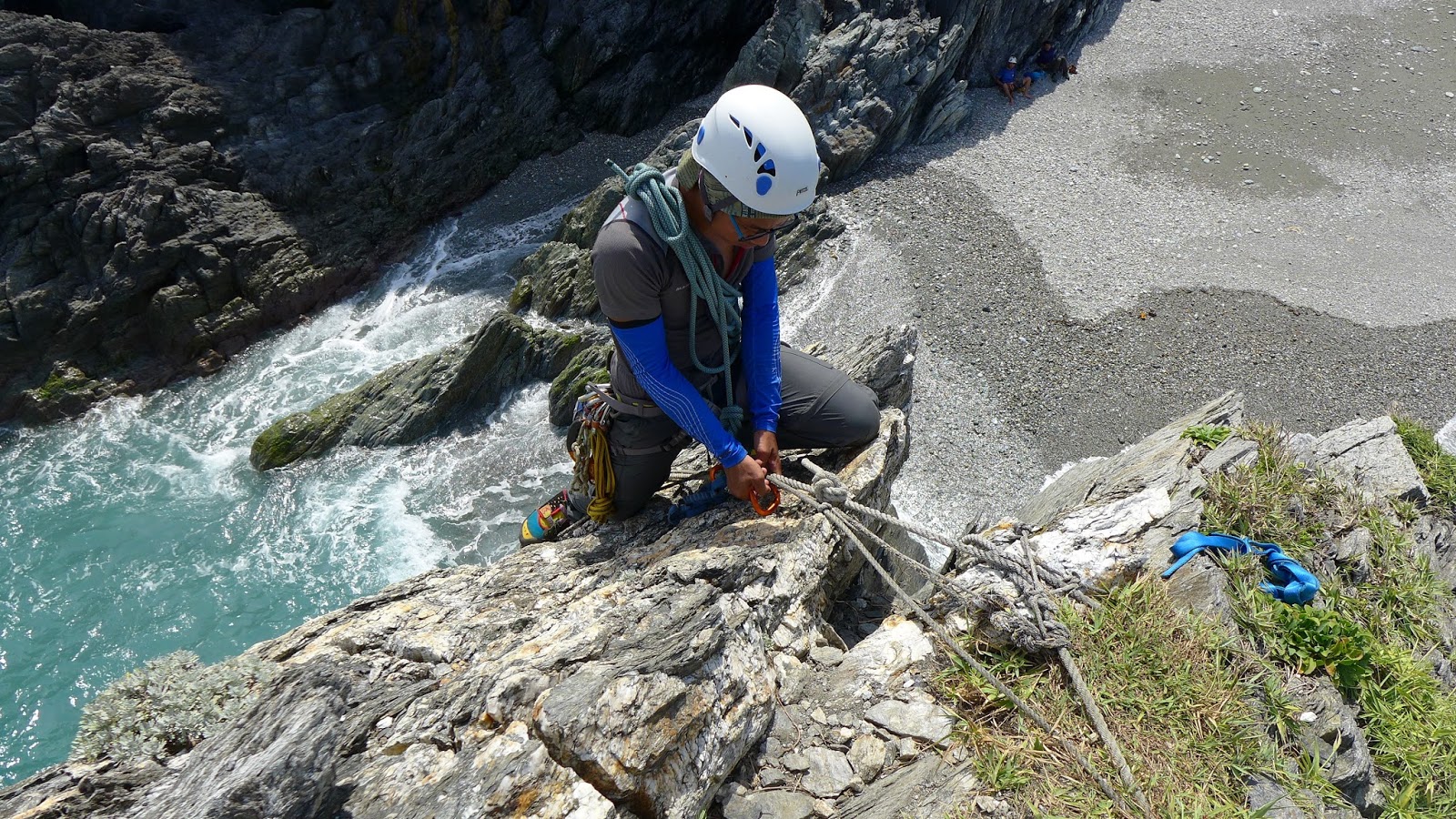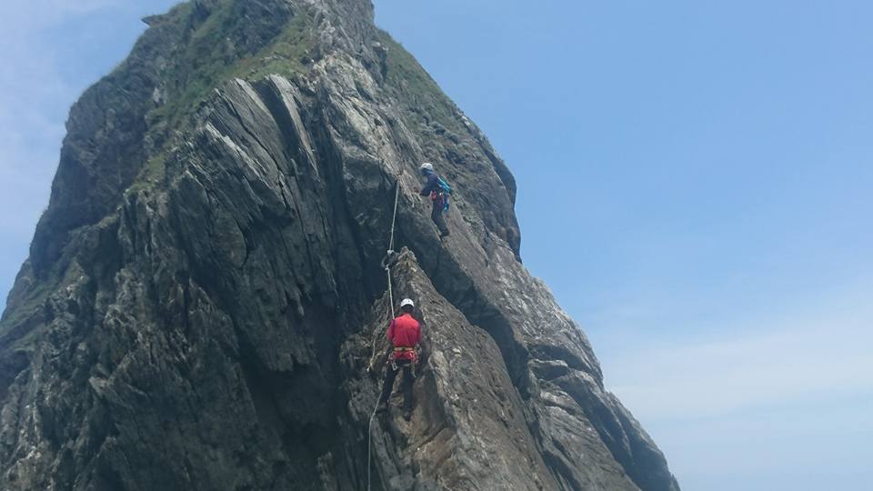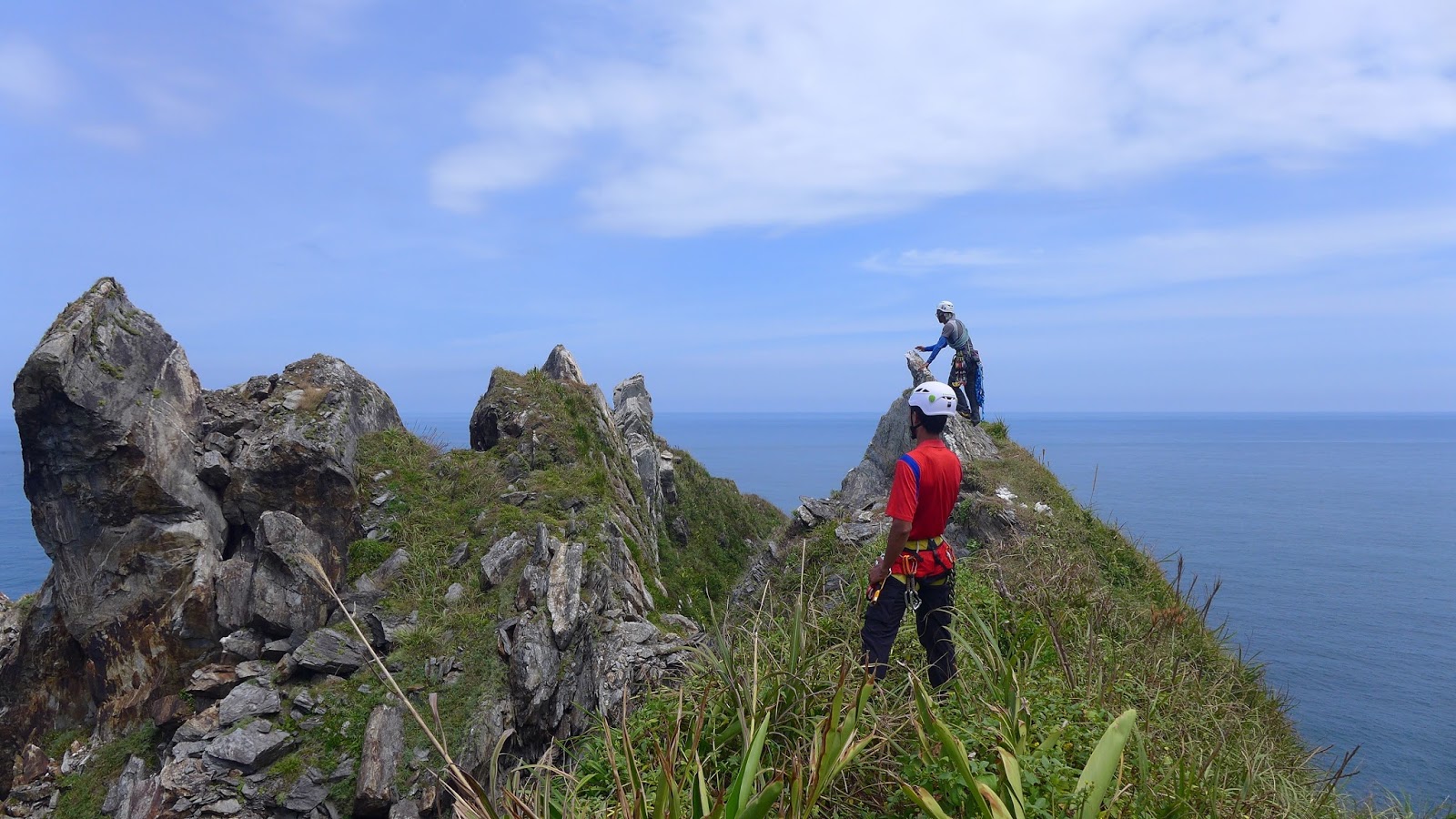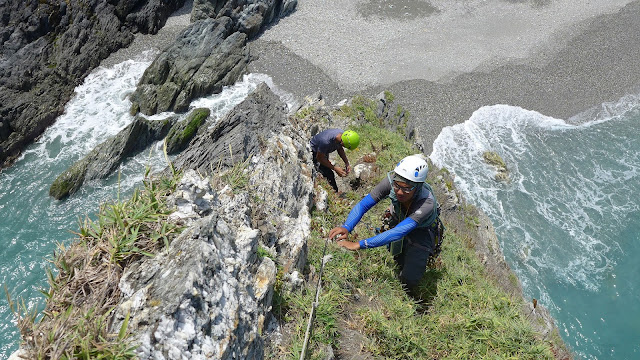 還是垂降好了,留繩避免下午漲潮腰繞路無法走,上攀撤退用