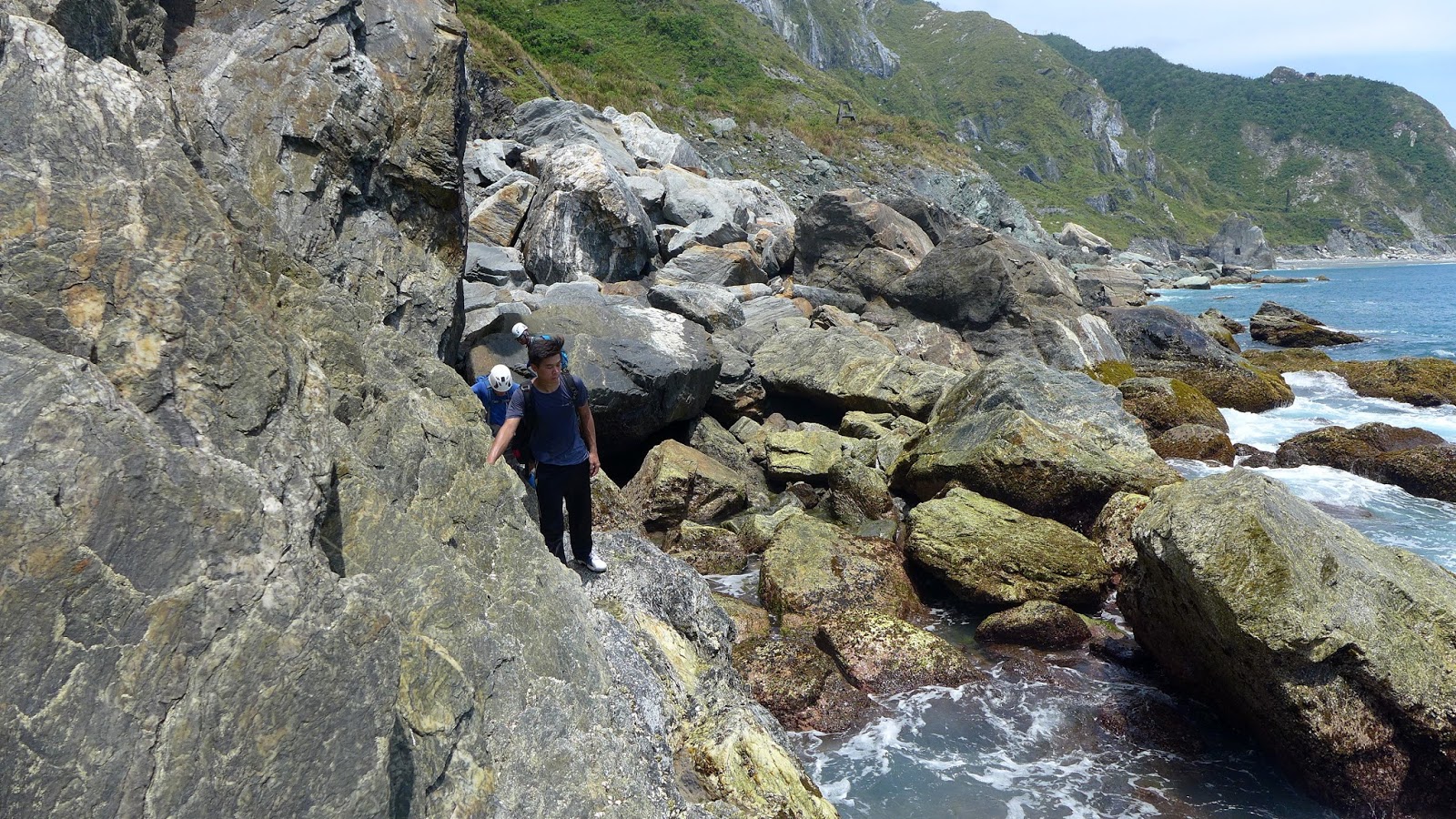 通過後馬上第2關卡,一樣退潮時可繞過,但到沙灘前有一處要稍跳,可能會浸濕腳,我和郭寶上攀到岩壁上去架垂降繩,永宏、ㄚ銓、吳敵直接繞過去衝了。