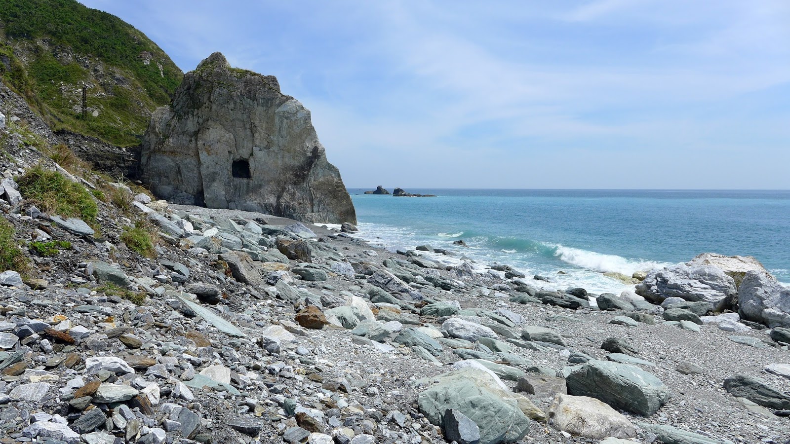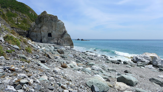 下到沙灘,真正貼近烏岩角了,上攀前先去海蝕洞大休一會,太陽太強了,有點招架不住。