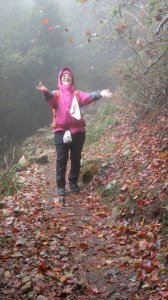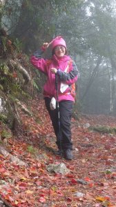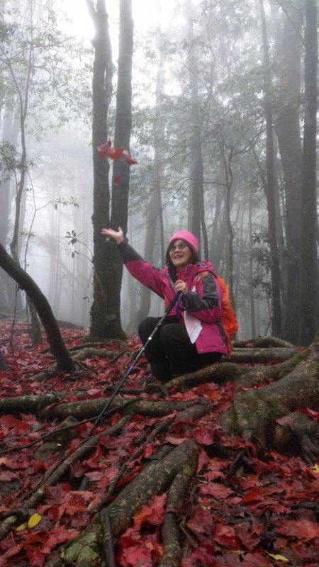 越過三角點往稍來山南峰前進,有段泥濘下切的路,看似夢醒,才回到現實又陷入夢境,穿入仙境,玩興大起,落下的紅葉比起高掛在樹稍更顯得真實可親近,大地因此也增添了些許美麗的色彩,冷冽的空氣頓時被紅的暖起來.