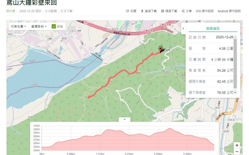 鳶山彩壁 大叔 2021-02-09 發表 1,975 次點閱 4 次拍手 拍個手吧 收藏 檢舉 分享 分享至 Facebook LINE 一日行程 出發日期 2020/12/26 回程日期 2020/12/26 相關路線 鳶山登山步道 、鳶山彩壁、福德坑山步道 相關山岳 鳶山 本文為網友的心得,以下內容不代表健行筆記立場。 Day 1 2020/12/26 鳶山聖蹟(大鐘)有幾個停車位。如果只要到鳶山秘境,路程大約幾分鐘。但如果要到彩壁,從鳶山大鐘這頭走會比較遠,可以考慮由另一側攀登。 原始路徑多,雨天,很滑。建議可以穿雨鞋。 06:47 鳶山大鐘 06:57 鳶山聖蹟碑 07:00 往鳶山岩有一些小攀爬 07:14 鳶山岩景緻很讚(鳶山秘境) 07:51 往常春嶺 08:00 沿途原始路徑多 08:14 長春嶺 08:35 中間的涼亭 08:51 福德嶺 08:54 鳶山(福德坑山) 08:59 往彩壁 09:14 一路都是原始路徑 09:33 鳶山彩壁 09:54 回程 11:10 長春嶺