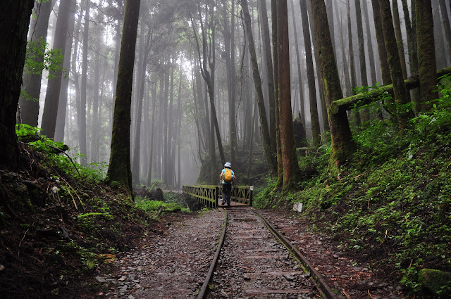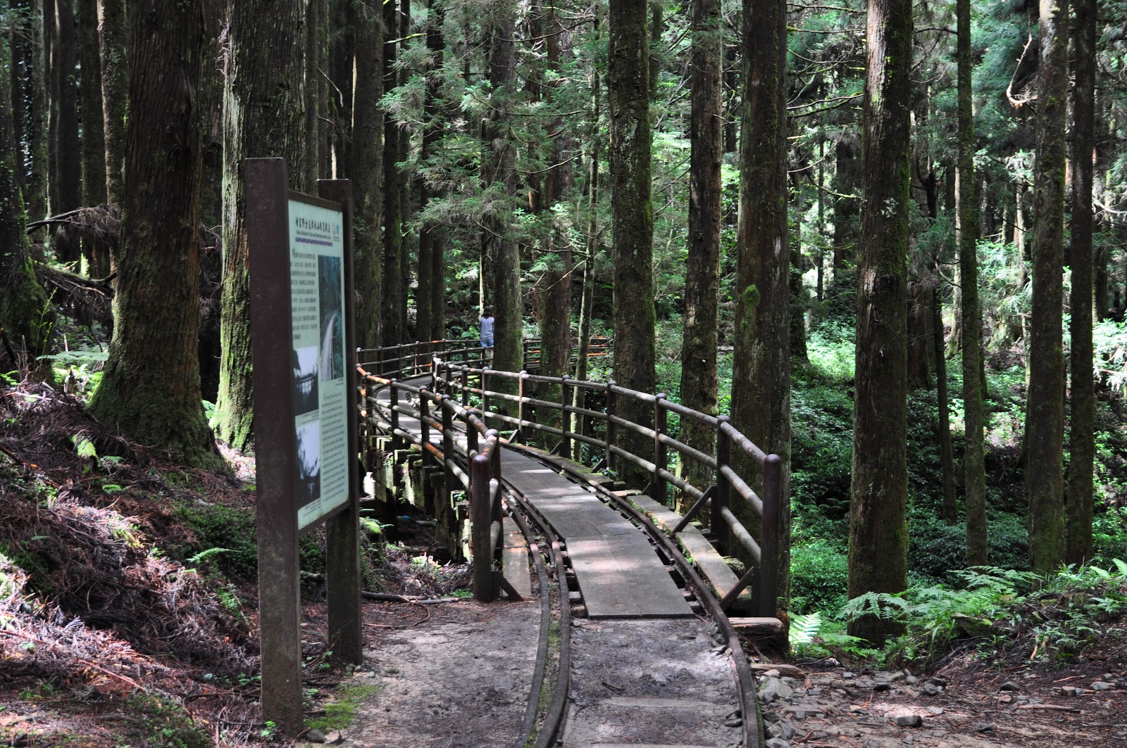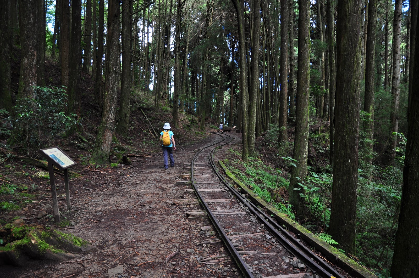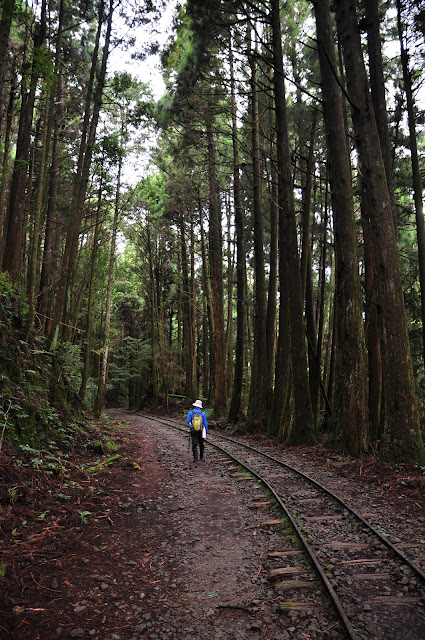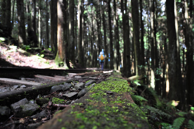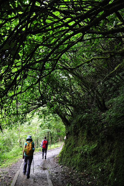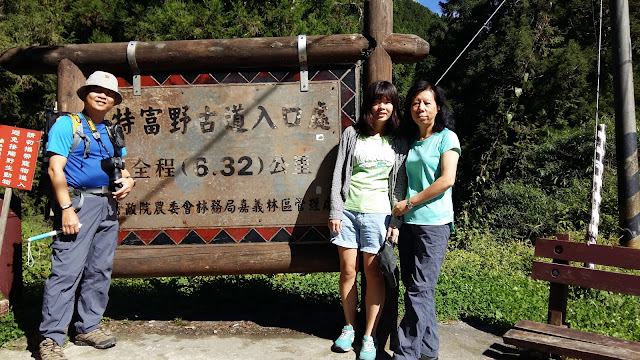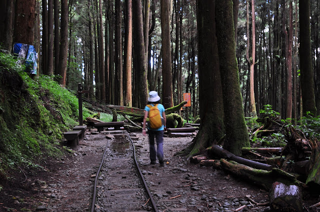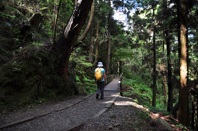 由嘉義阿里山鄉自忠的入口處海拔高度約為2280m進入, 全長6.32km出口在特富野,如不原路往返就必須兩地接駁, 我們選擇原路來回因此走了約13km, 此古道的前3.7km 皆是平坦且寬的碎石泥土路再加上火車軌道與橋樑, 林相為人造的柳杉林偶有大樹頭真優美, 過3.7km就是向下的階梯步道直到出口特富野處海拔約為1780m, 林相到此也漸漸改成闊葉林 , 所以後2.6km共下降了500m高度左右, 去程沒啥感覺, 回程時就必須還債了