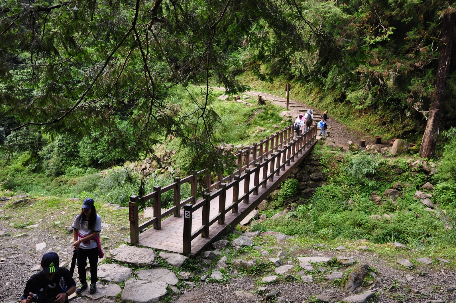 前段平坦的路徑偶有橋樑鐵軌在其上, 這是日治時代所修築的水山線鐵道用於伐木運輸的遺跡
