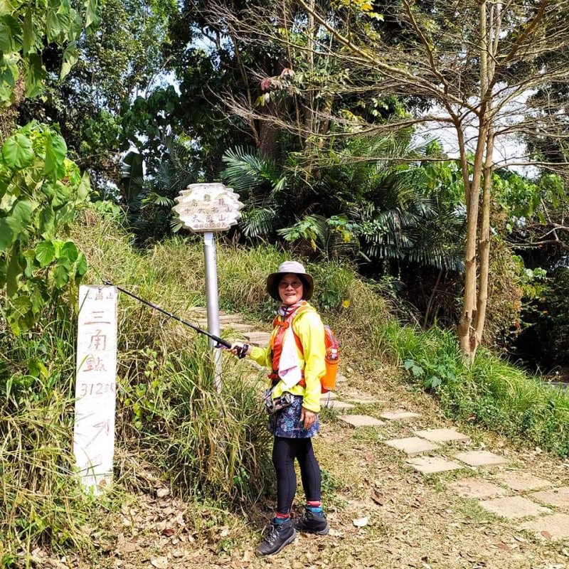走著走著到了三角點的標示牌,這裡不是三角點,要往小階梯上,真的好不容易要走階梯了可以轉換腳步,哈哈哈哈哈!不到50公尺,三角點就在眼前,趕緊拍一下,自己越來越喜歡跟三角點合照,怎奈團員太多共有81名,大家依序排隊,嚮導為了掌控時時間在旁不斷呼喊好了,前進,好了,走,所以才拍到一張照片,