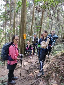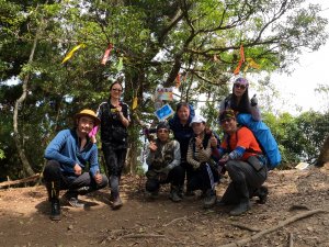 經2小時的溼滑山路洗禮,終於來到了光天高山1123m,全員安全順利的完成攀巨石岩壁,切溪谷V型陡上地型,有點擔心的心情豁然開朗,今天較難掌握的行程圓滿完成,接下來就只要在陵線上行走,沒有危險的路段,一切交給時間來決定行程長短了,小休20分鐘,吃水果乾糧,喝熱茶紅牛,舒緩壓力一下....舒服
