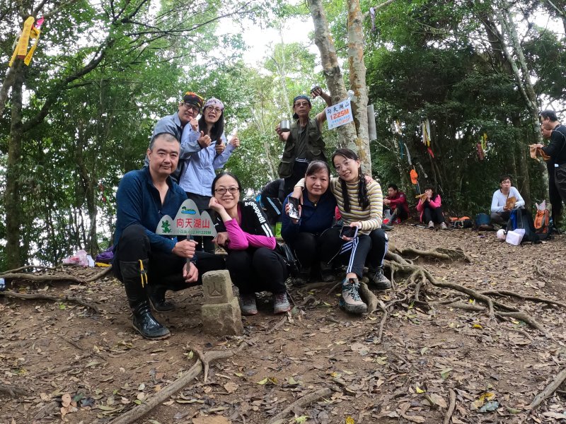 11:35來到向天湖山1225m,下重裝,舖地墊,生火煮泡麵,芋頭瘦肉粥,山頂上各路英雄好漢,川流不息的上山打卡拍照,熱鬧非凡,大家各彈各的歡樂曲,笑聲連連此起彼落,雖吵鬧不休卻一點也不違合,這就是越來越多人愛上爬山的地方,在這沒有貧富貴賤,沒有老幼尊卑,大家都一樣要用雙腿毅力,才能上到山頂朝聖