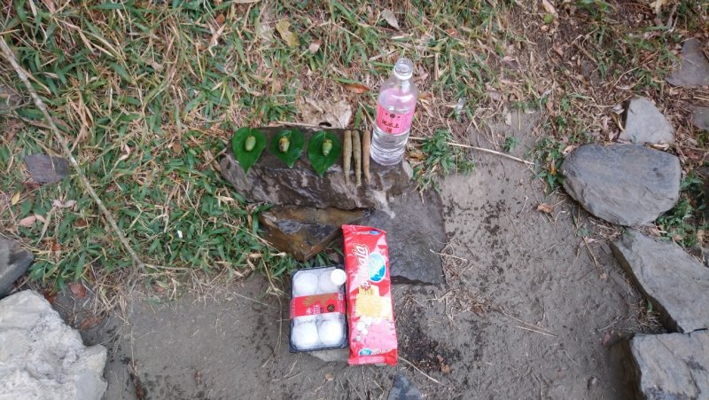 巧遇來自台東的阿美族朋友依上帝的指示來此祭拜山神,在地上擺上祭祀的物品