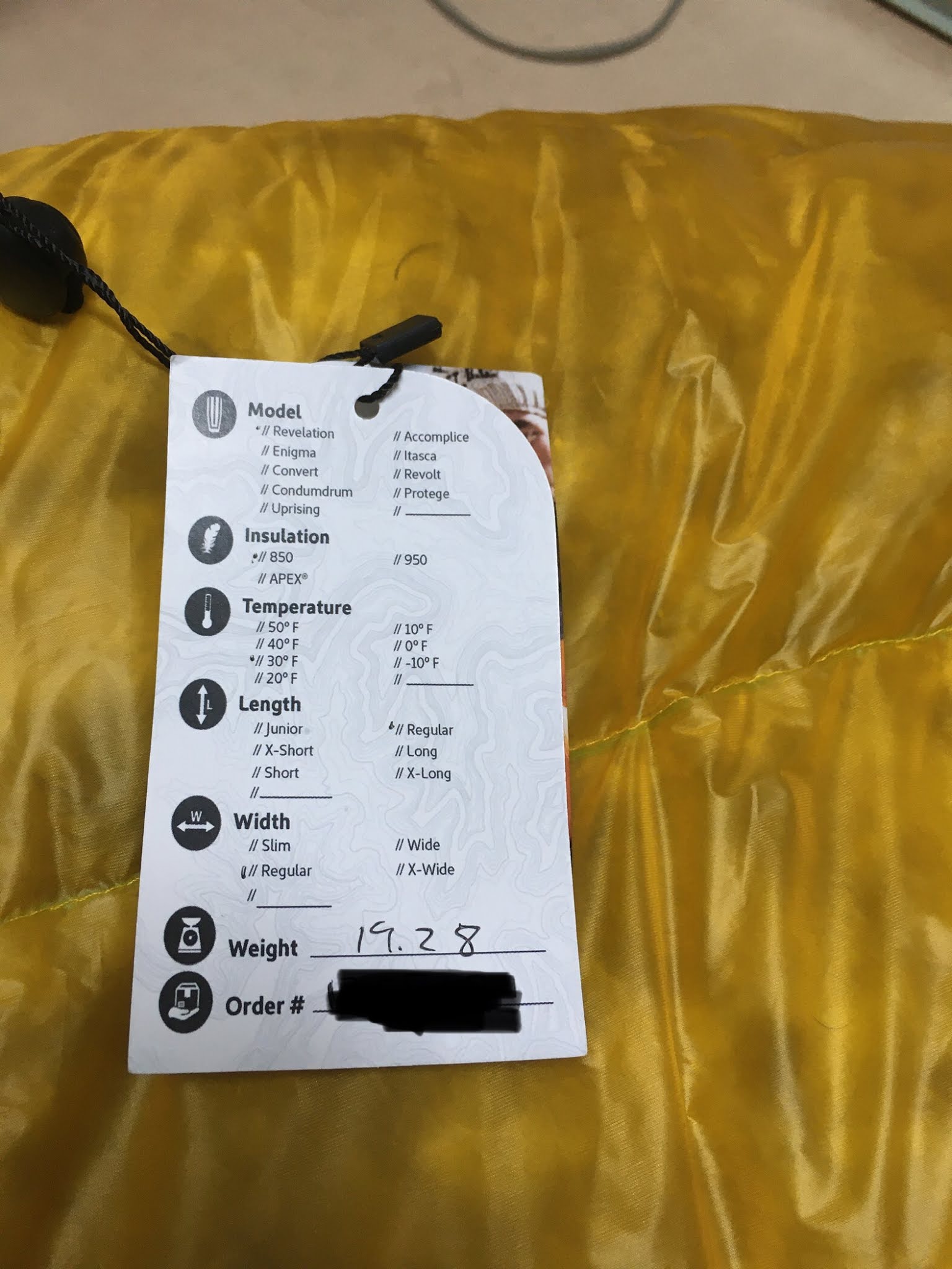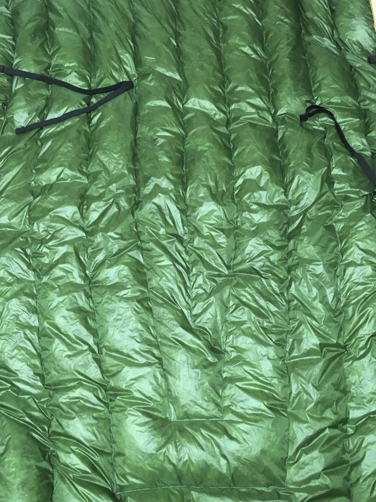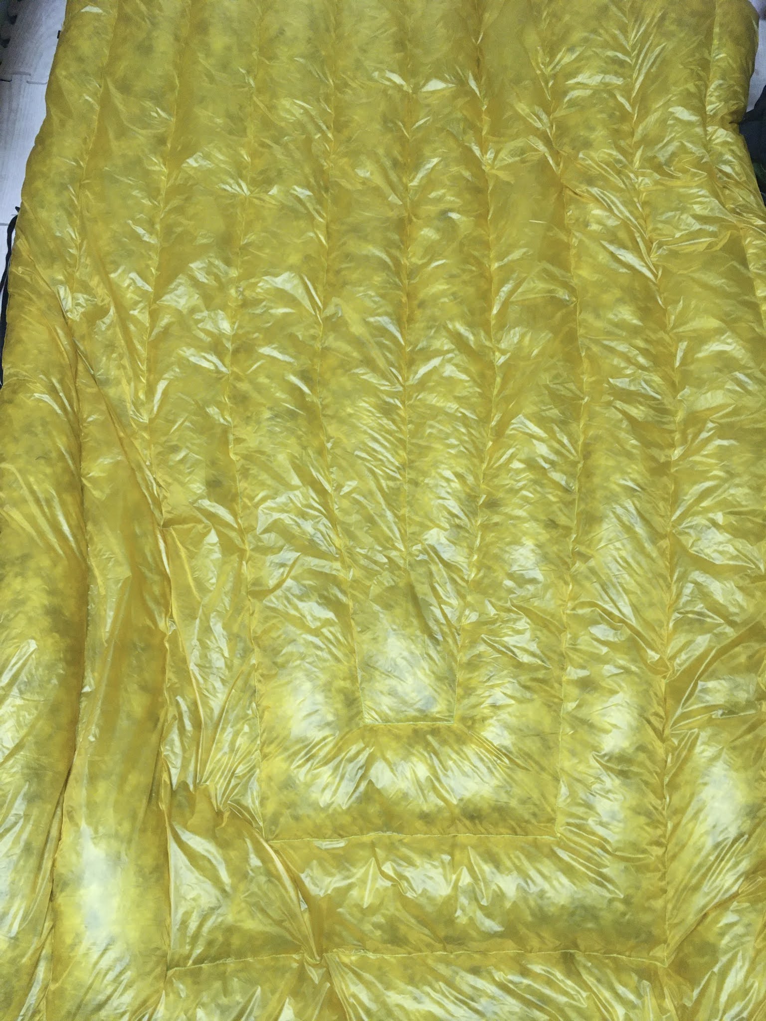 這次我購買的是Revelation、850FP、30F、長度Regular、寬度Regular、無Draft Collar、表布10D黃色、裡布10D綠色的款式,目前使用過的行程是清明節的奇萊東稜,營地大致上都在3000m左右,夜間氣溫約10度或更低,有一晚有把足袋綁起來,其餘都是攤開蓋著,另外下山前一晚海拔較低所以夜間溫度大約是16度,即使是攤開蓋也會有太熱的感覺。雖然目前僅使用一次,但是以自己實測的結果來評估的話,三季使用我比較建議買40F的羽絨被,30F在中低海拔還是太熱了一點。做工上都算是滿意,唯一有不滿的就是表布有點透明,所以會看見裡面的黑色羽絨,這點跟官方照片上呈現的感覺有落差,不過看久也就習慣了。