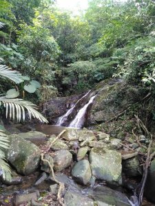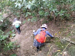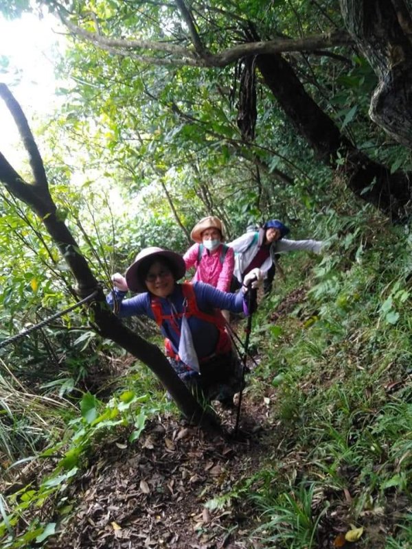 偶有土石的坡距大,著實考驗短腿族的能耐,此路徑濕滑雨鞋才是最佳選擇,前2/3的泥石路都是小case,老闆佛心都有繩可以拉,不算難應付,最後的1/3路是箭竹林掩覆,腳下是泥濘陡上的泥土路沒有階可踏,登山杖不太牢靠,要手抓住一把箭竹,腳盡量往兩旁塔,慢慢挺進,是滑倒後才領悟了,第一次的殘壘就這樣給了