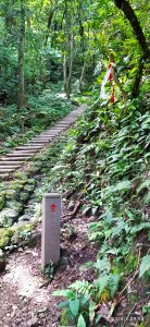 由此登山口上,改由左前方的登山口上,此路徑林木茂密且有植物介紹立牌,不用猜也不用查,真的好棒,沿途經過兩個遺址,但都不見建築物,只能想像了,路徑都是階梯,考驗大腿四頭肌,最後一小段拉繩上頂有遮棚土地公,有鐵條椅子可供小休,前方有簡易廁所可應急.到此左轉續往五分山走,已是稜線無遮陰,也是綿延不絕的階梯