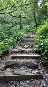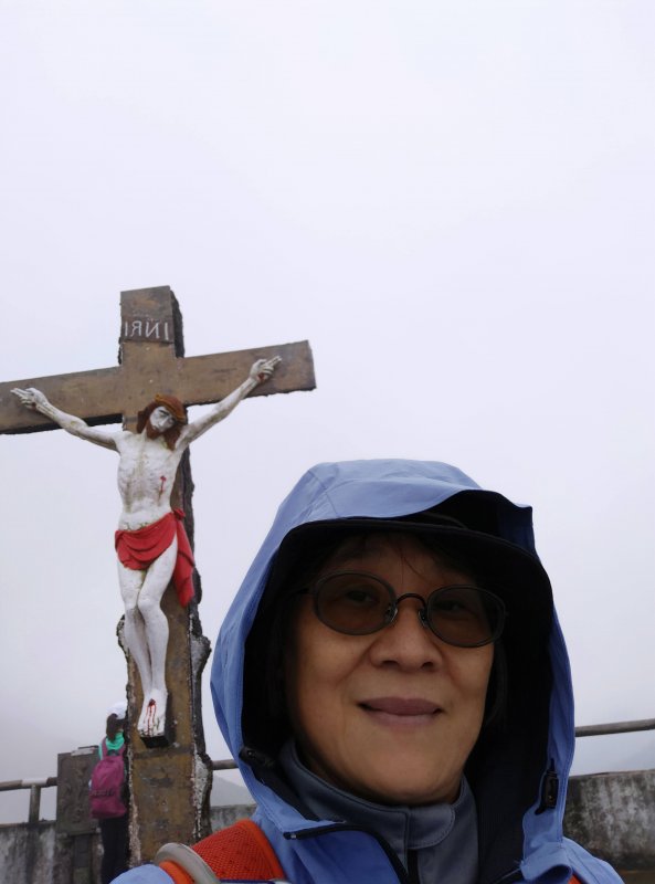 沿途山徑一路陡上,每層階梯高低不一的自然林道,此時竟然飄起小雨,林道泥濘,石階濕滑,需要步步為營,拄著登山杖,踏好踏穩,調整好呼吸,努力爬著,巧遇兩位山友要回程,感慨說她們已第三次拜訪抹茶山都是白茫茫的,下次不來了,阿....,想必我今日也是槓龜了,既來之則安之吧!只剩0.2K就登頂了,回頭