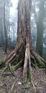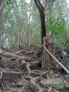 山徑十分原始,樹根纏繞,粗細不一,歪七扭八,也因為這樣讓探訪客可以憑以階擋,雜木叢林,樹形奇特比比皆是,有老有少,有似動物,形成另一世界景觀,說實在的那時的我,還不會享受身在山林的樂趣,百分之八十的時間,都在埋首向前,也無手拍照,山友見我一人,好心幫忙留照,感謝.