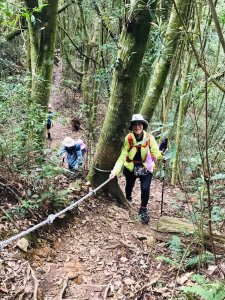 回程才是挑戰一路爬升,又有山嵐起舞,我看不懂她的舞曲,只顧喘跟著休息,旁邊資深山友提醒我,氣溫下降了,不要休息太久,怕吸入很空氣會傷身,謝謝山友一路指引,安全回到集合點,全身內外皆濕,背包也沒倖免,滿滿的回憶在腦海中.