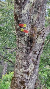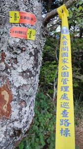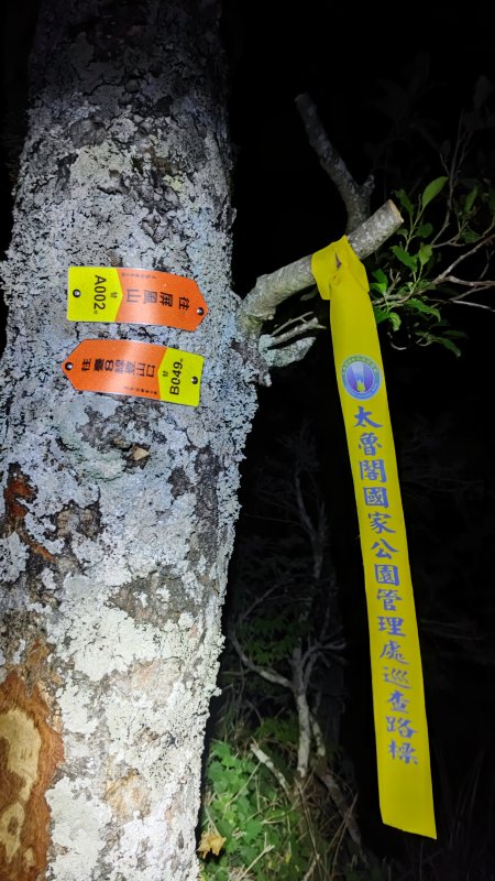 “太魯閣國家公園管理處巡查路標(黃底藍字的綁條)”+釘在樹上的橘/黃雙色黑字金屬編號牌(會反光),整體路徑指示是真的非常清楚,到溪谷要涉水過溪(第一次)接著要沿溪小走幾十米需再陡上往新舊路交會點(金屬牌屏風山-替-A043)接著要再過溪,但是走鐵線橋(第二次),再接著往松針營地的路是平坦好走的一段