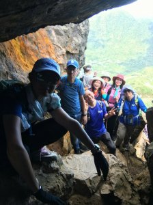 進入壺穴爬上壺嘴繞一圈,不懼高的紛紛上大石頭拍照,我則怕一時平衡差,所以欣賞就好,此次行程縱走半屏山要越過這大石坡,踩點距離有點大,腿短的比較辛苦,爬山時常常覺得腿長的不知腿短的辛苦,哈