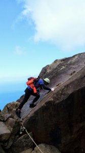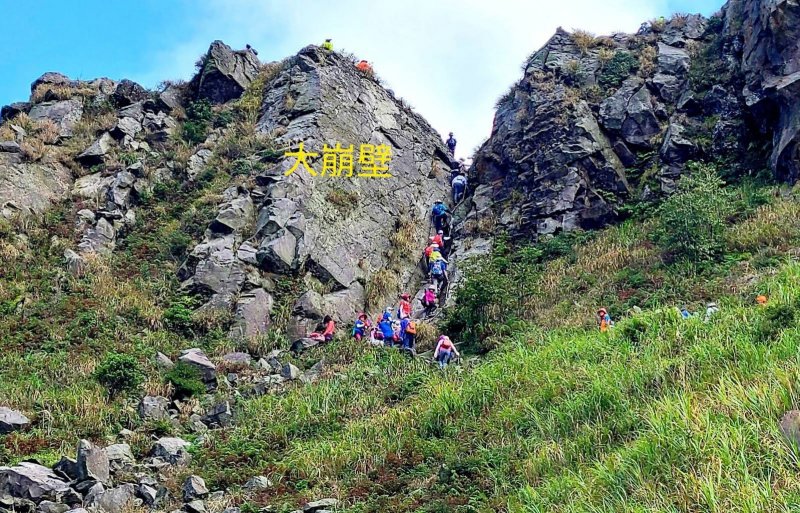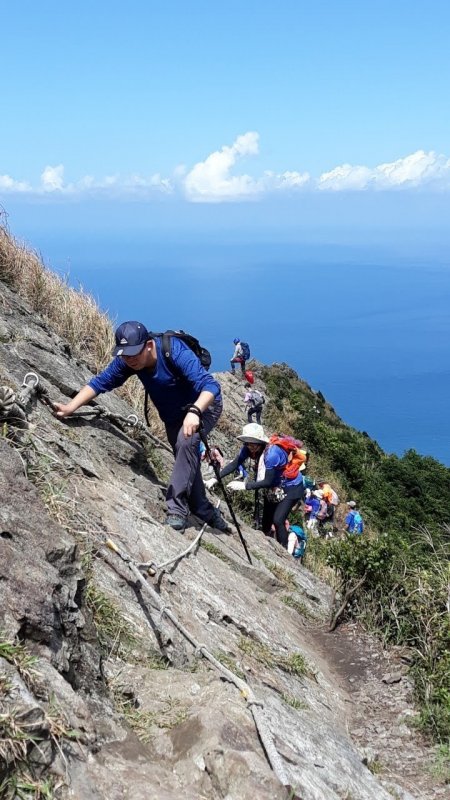 過了這裡走一段稜線,來到大崩壁,又是個挑戰,拉繩索找踏點,還蠻有趣的,只是天氣真的太好,視線佳,汗水也豐沛,熱阿
