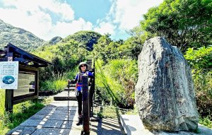 上了大崩壁就要橫著走半屏山,感覺自己是螃蟹,然而也要小心走有幾處的踏點距離頗大,正在想著怎麽走時,有對年輕情侶說阿姨,左腳踩這邊右腳那邊,咦!原來自己已不是姊很久了,接下來路徑都很容易走,出黃金博物館,搭車返家,結束了有成就感的一天,值得再探的步道.