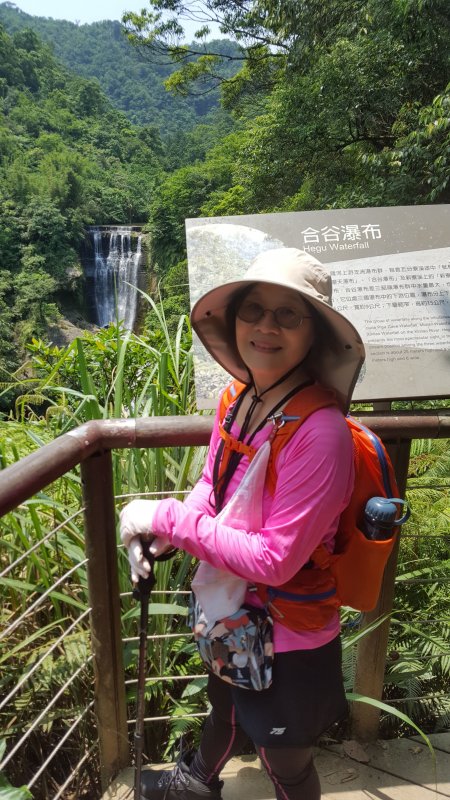 到的標示牌就是合谷瀑布,彎入觀瀑台欣賞,水流從翠綠的林中傾洩而出,雖然無法聽到水流的聲音,不過可以想像就是嘩啦啦的,觀瀑台小小的,不適合久留,今天不去三貂嶺瀑布,原路折返,觀瀑也不能餓肚子,