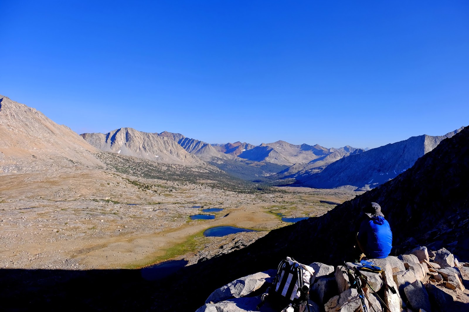 JMT總共有八個隘口要通過,麥瑟隘口是我們覺得最難的一個。它的高度(海拔3685公尺))並不是最高的,但從南端上攀的路段又臭又長,從營地出發後幾乎都在上坡。最後兩公里走在裸露的岩塊和碎石上,無論怎麼繞,都覺得自己無法走到頂點。山壁像一道牆,我發出無聲的哀號。