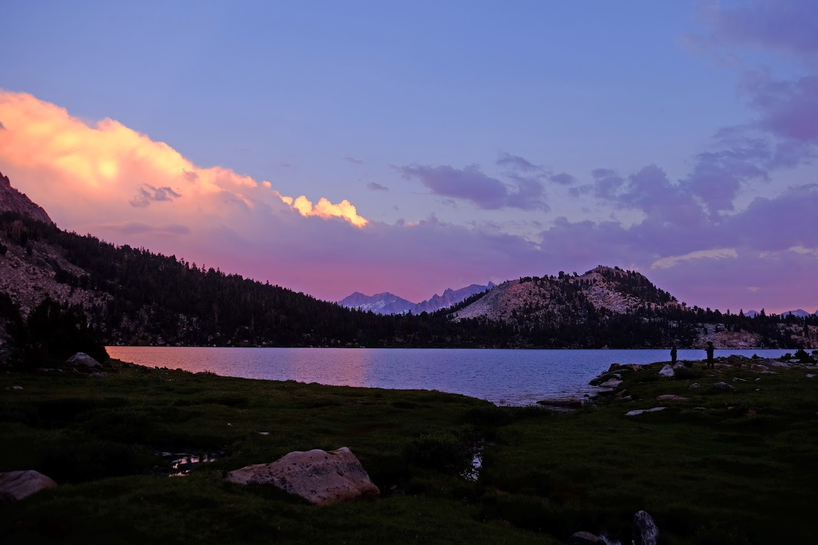 狹長的湖岸有近三公里長,在湖的南邊有一座半島將進化湖一分為二,僅留一道細長的通道,四周都是巍然聳立的山峰,極高的落差有一種山壁就要塌下來的錯覺。被山谷圍繞的湖面,光影變化之快速和豐富,可說是整段JMT之最。