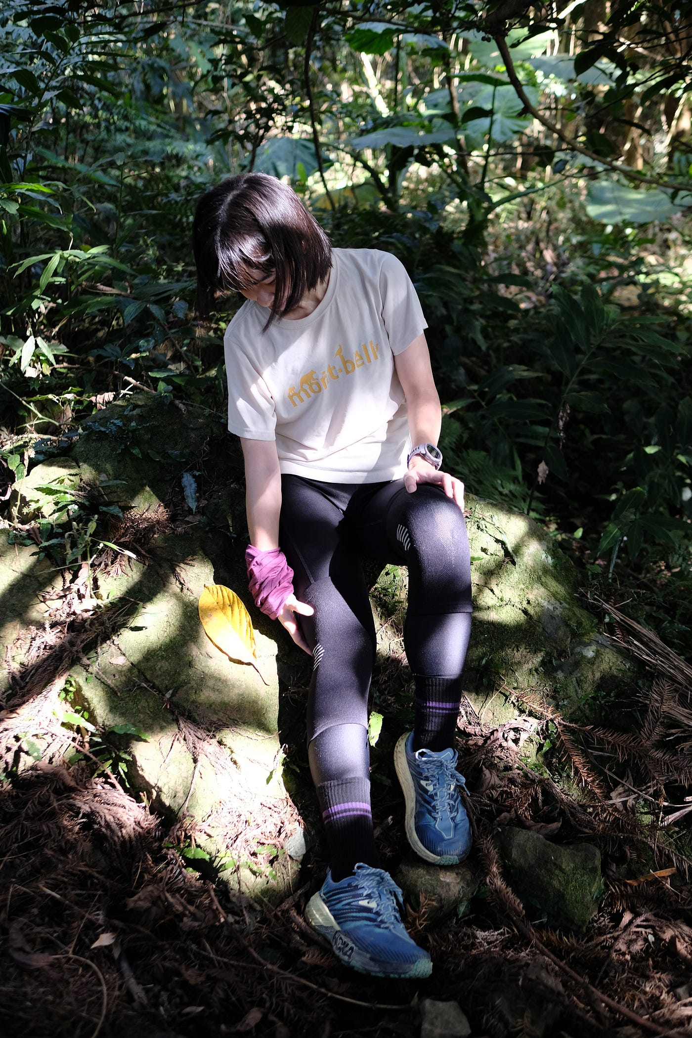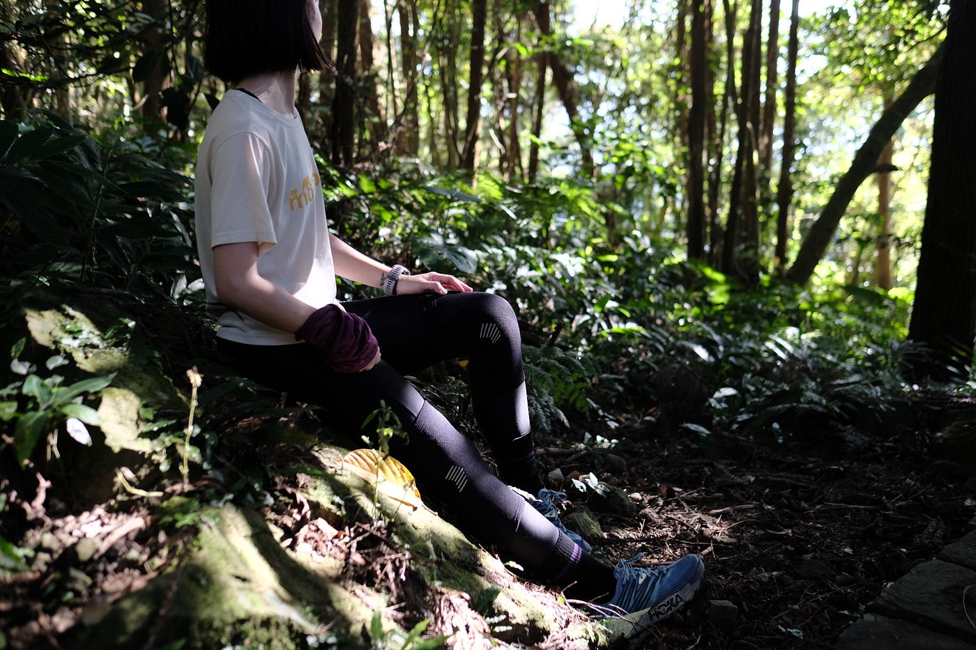 一開始的時候我是穿著海樂緹護膝爬坡的,支撐力&包覆性很足夠,且穿上去之後不久,膝蓋真的會有溫溫熱熱的感覺,加速膝蓋熱開。不過到中途之後,我就先把護膝退到小腿肚當腿套了,護膝本來就不是可以長時間穿戴的器具,大概穿個3小時就要拿下來讓血液流通一下。等到最後大尖山吃飯休息後,才又把護膝穿上去保暖膝蓋。
