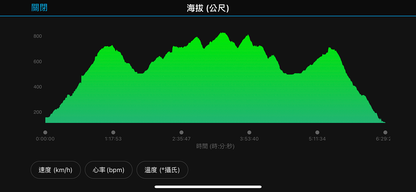 這是用Garmin 手錶紀錄的高度圖,由高度圖可以看到最後要回到原點時,要經歷一大段的陡下,那時候經過整天的爬升,腿力已大大打折,若此時出現膝蓋不適的症狀,可以穿護膝保護一下膝蓋。