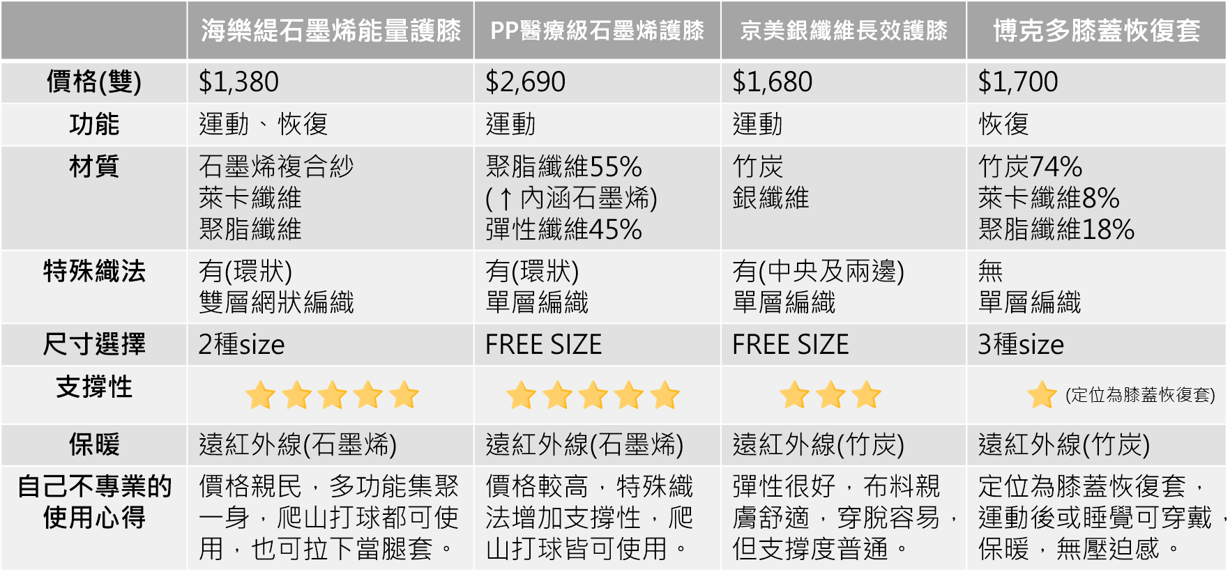 剛好手上陸陸續續收集了一些機能護膝,這次主要針對四種護膝品牌做個小評測,先用個表格來統整一下