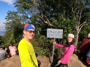 終於登頂石牛山,今天山上人聲鼎沸,40多人擠在10多坪的山上拍照取景,真的連錯身都有困難,兩公婆不免俗的與石牛山標牌合照留念