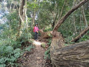 經過一大段,走一步退兩步的滑溜陡坡,上到平緩山徑,一棵大樹倒木,如蛇行彎延,在此小休喝口熱茶後續行
