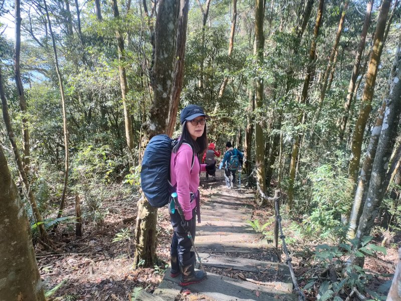 還好下坡路雖險,但不長,接回木馬道階梯路,離開了山徑,回到了觀光路線,一路寬大好走木枕階梯,輕風徐徐吹來,輕鬆愉快的往橫嶺山6.6K前行