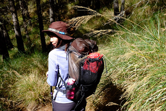 我覺得MINI2擁有的彈性更高,一口氣可以將容量往上推30+L,正面的網狀口袋可以放置岩盔而不用擔心掉落,側面的口袋可以同時放入兩個水瓶。照片中藍色衣服的女生才153cm,若買歐美品牌的登山包可能會因為嬌小的身材相對的挑剔,背上mini2則是很符合其身型。
