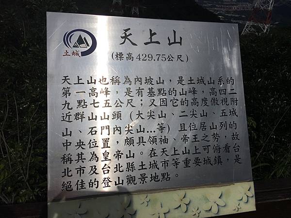 天上山位於新北土城三峽交接處,因地勢高,在山頂能環顧周遭山頭,給人一種高高在上的感覺,故又稱 「皇帝山」 。也因為地理位置良好,不僅能俯瞰土城 、 大台北市區,還能與附近的南天母山 、 五城山等山脈遙遙相望,可說是市景及山容兼具。因此,擁有著一顆三等的三角點,顯示地處優越,真不愧對叫作「天上山」。