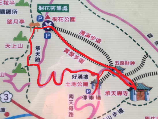 我們從南天母廣場下站,走好漢坡接往甘露公園的步道(13:35),右轉直攻天上山(13:55)。攻頂(14:10)後下山,途經望月亭(14:26)及桐花公園(14:44)入口,再銜接賞螢步道,於步道出口(15:00)後前往參觀承天禪寺,最後回到永寧捷運站的時間約16:00,總共花費約2小時多,在預計的時間點結束這趟登山行程。
