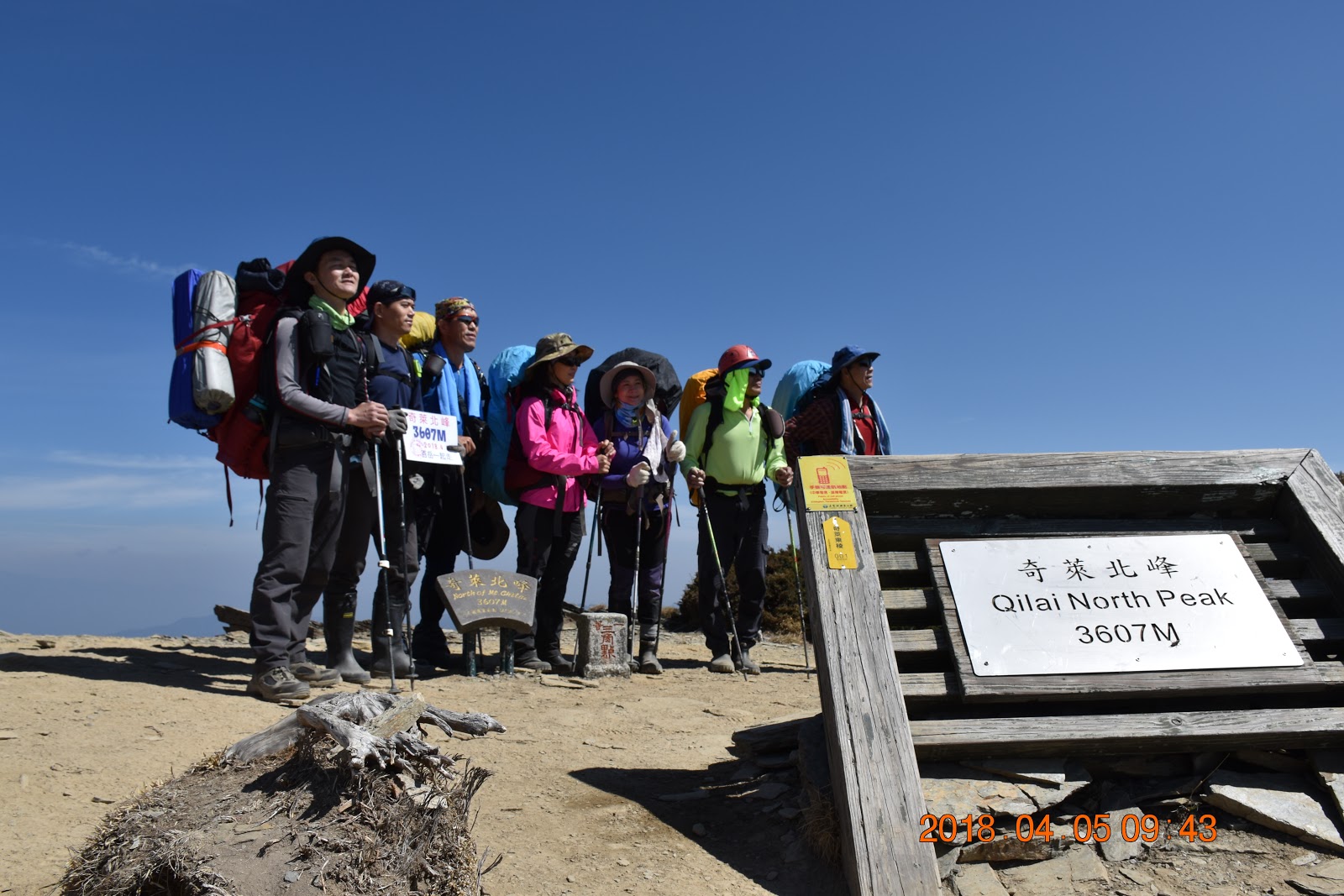 4月5日5點20分出發,今天要揹著重裝上奇萊北峰,天氣很好遠處可見合歡北峰反光板,在上到三叉路口可見奇萊南峰跟奇萊主峰,9點10分到達奇來北峰等後面隊友全部到達拍完團體照已經10點05分了,在北峰三角點待了一個鐘頭,上一次上來運氣可沒這麼好,下了三天雨一片白牆什麼都看不到,離開北峰下切至月形池,池水早已乾枯,找一處遮蔭處煮午餐,吃飽後走進森林地上還有一片殘雪,出森林劍竹草坡上又是艷陽高照,14點16分到驚嘆號池,犀牛說這裡有水源提議在這紮營,時間好像太早了點,用無線電詢問志宥意見後就在這紮營吧,拿不織布過濾池水顏色還是很重,煮久一點還是喝吧,入夜後溫度迅速下降,水鹿聚集在營地四周補充鹽分。
