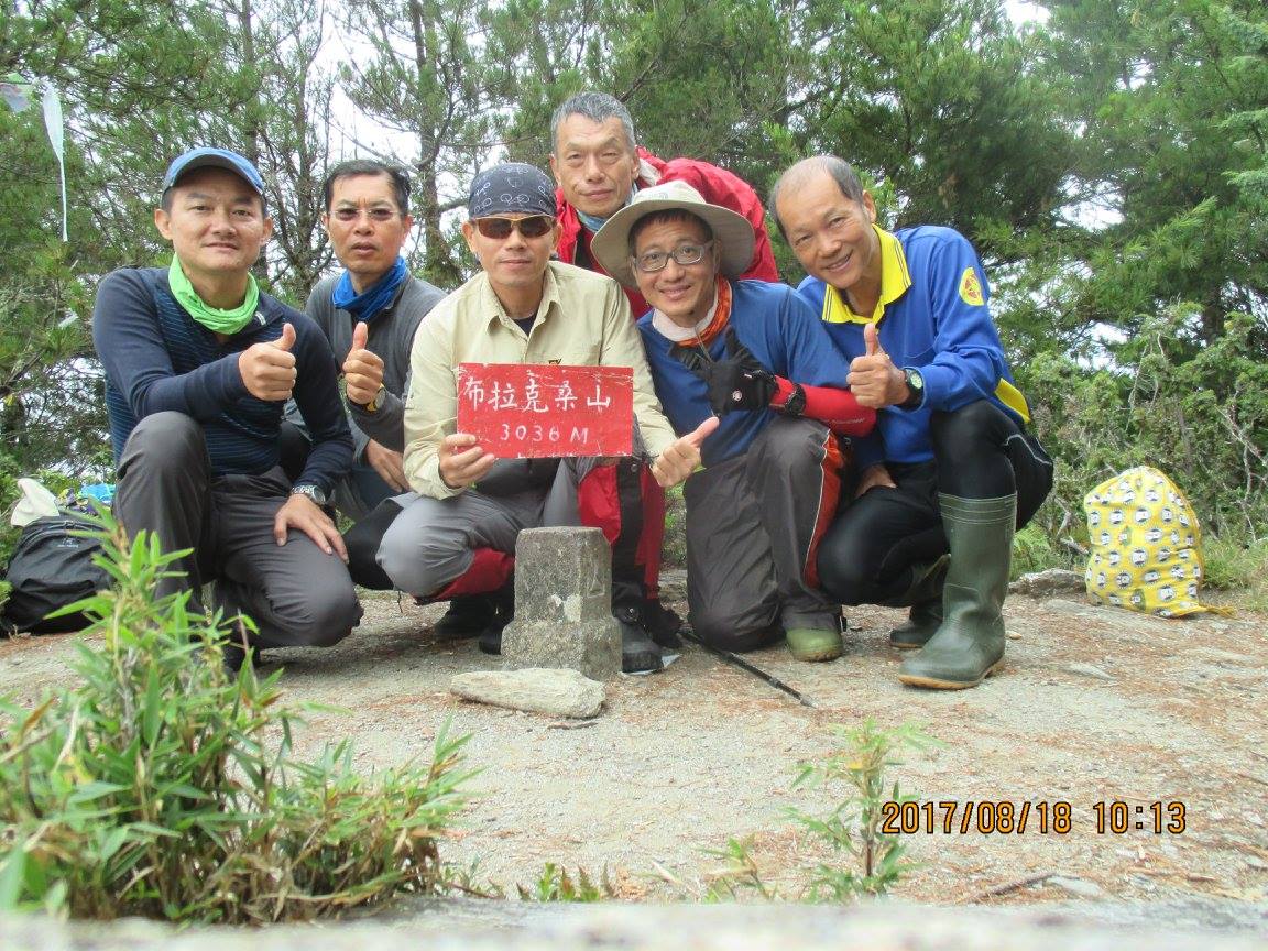 8月18日早上5點40分輕裝準備前往布拉克桑山,周醫師的另一名山友說他要在營休息,可能是昨天凌晨三點從向陽營地出發走到布新營地太操勞了,加上長時間曝曬有熱到,剩下五個人出發,因為昨天下午的午後雷陣雨讓劍竹上沾滿了雨水,大家穿上雨褲7點30分到大草原窪地休息,9點30分抵達布拉克桑山。周醫師說我們這一團是他帶隊走這條路線速度最快的 一次,不知不覺就已經走到布拉克桑山了,應該是腳程都很平均吧,不用一直停下來等隊友有沒有跟上,拍了好幾張登頂照後回到布新營地才1點35分,下午當然就自由活動了,在樹上綁了一條風繩把衣服褲子掛在上面晾乾。
