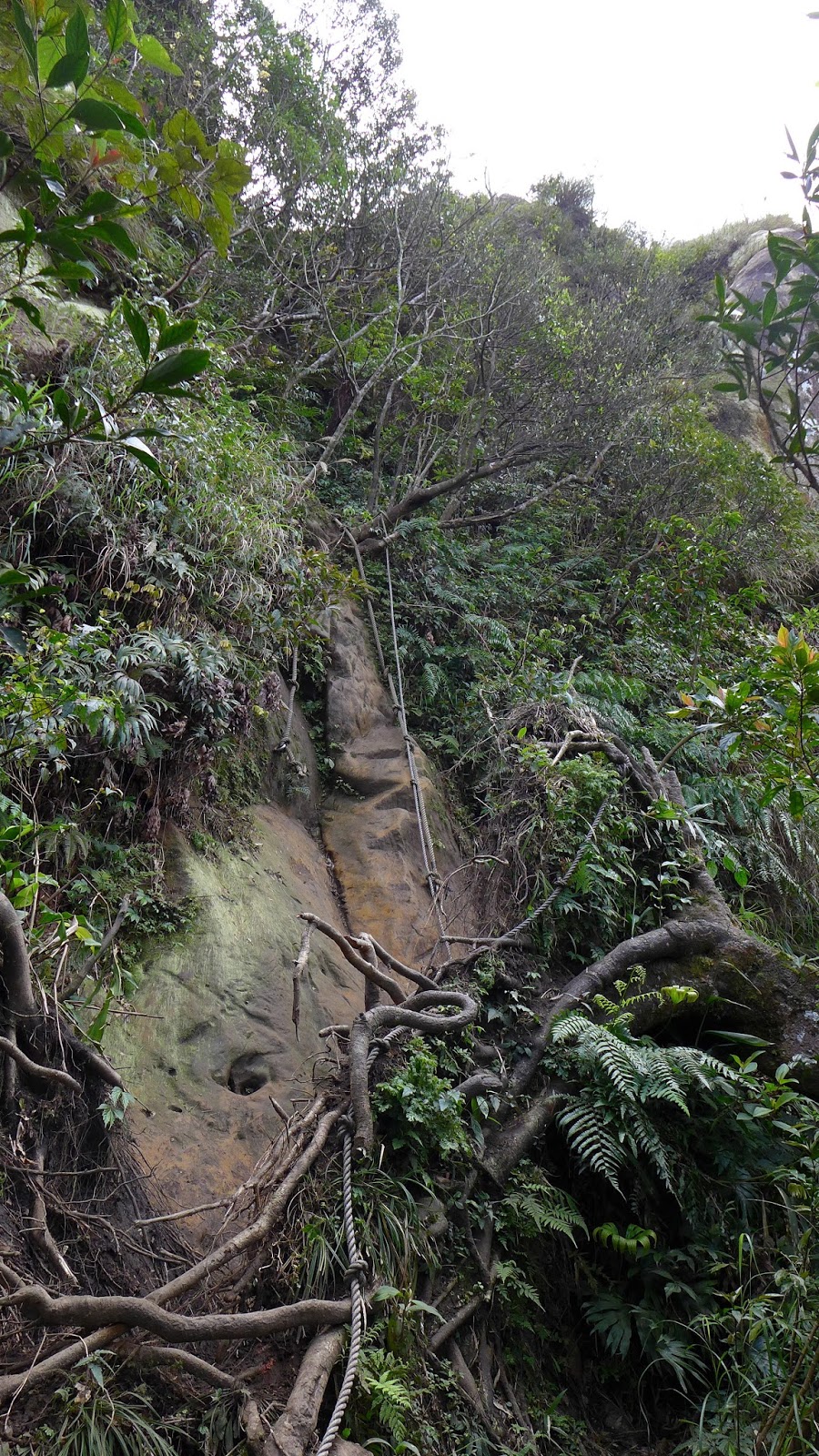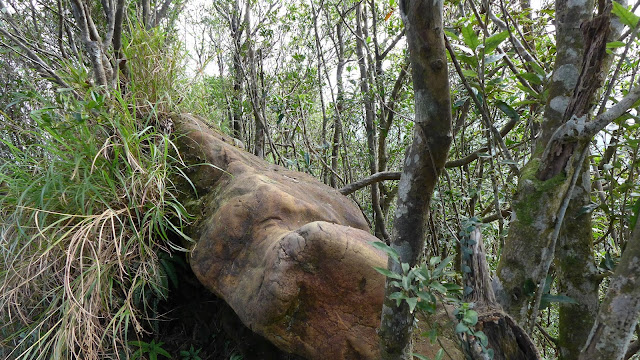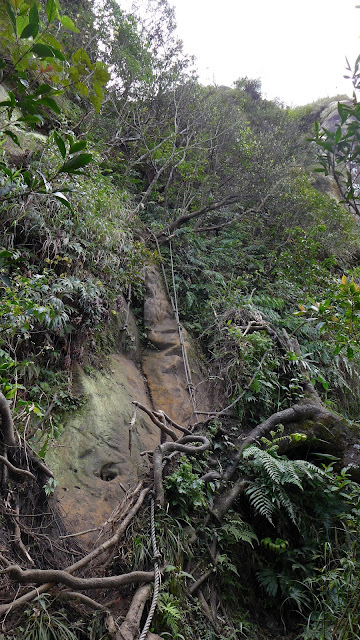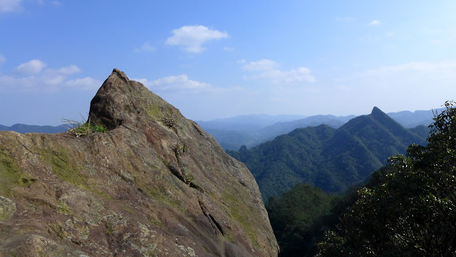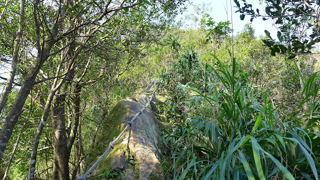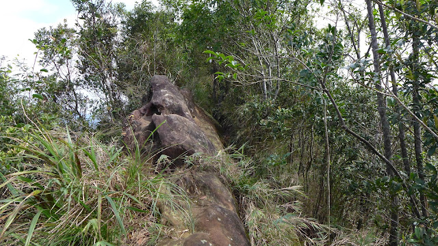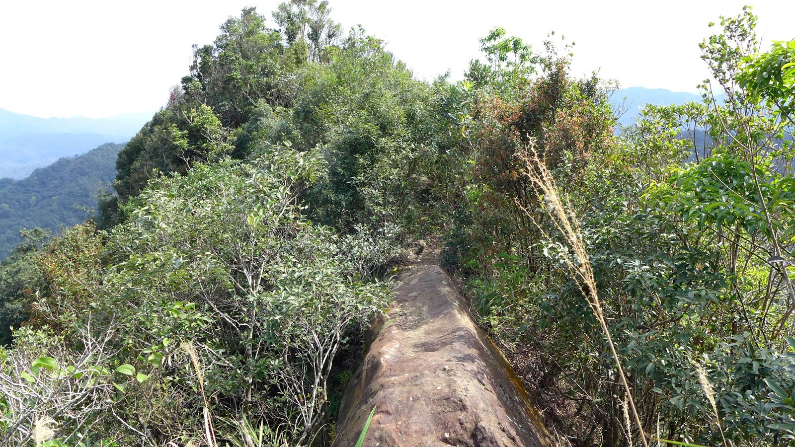 再來到峰頭東峰前這一段瘦稜是這裡最精彩的地方,如果不是兩側植被的因素,這一段的裸露感會相當有勁,加上會滑,走起來有些地方稍微傷腦筋一下。