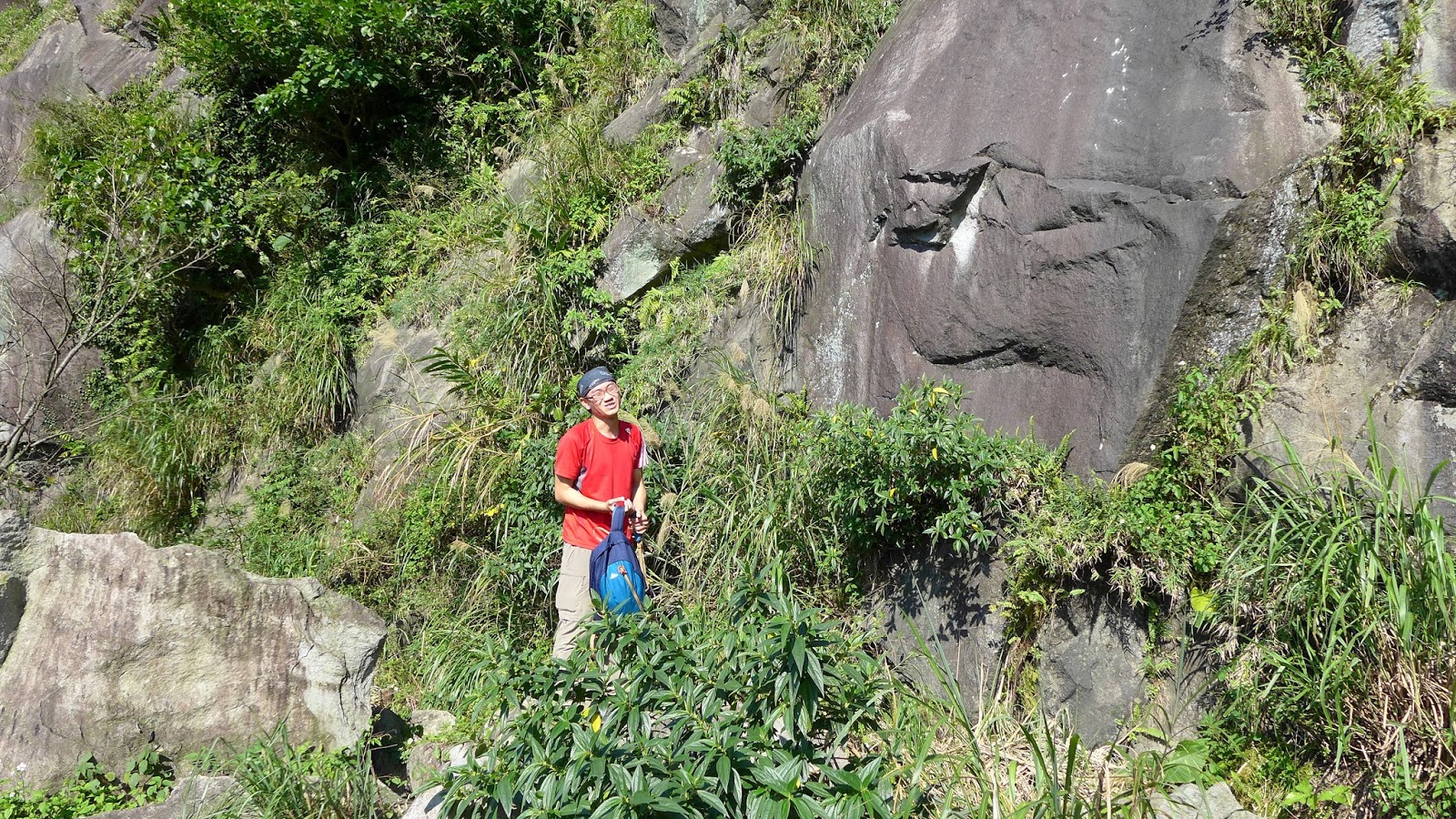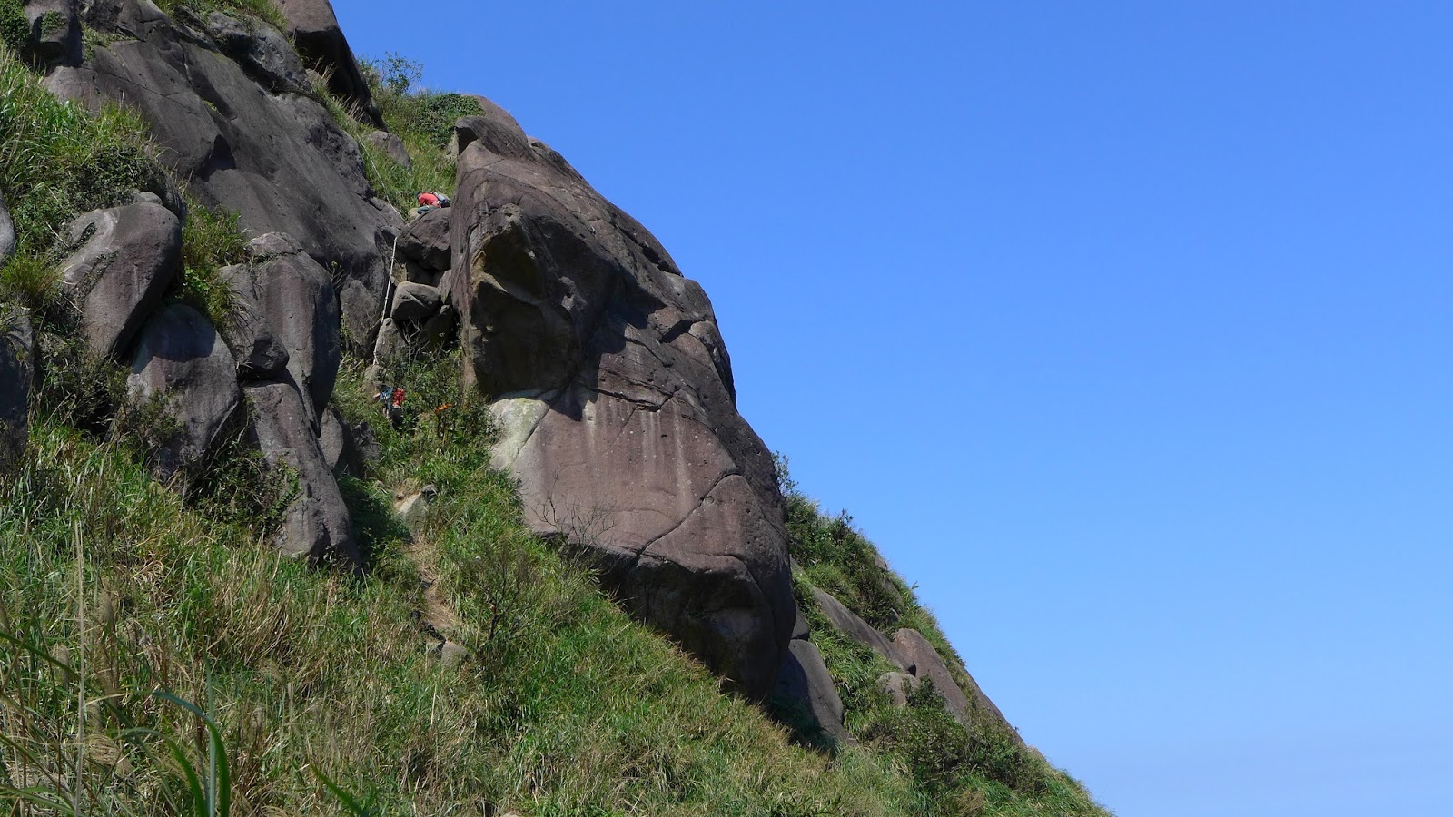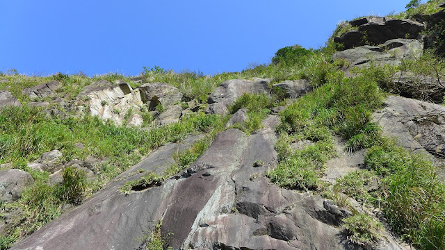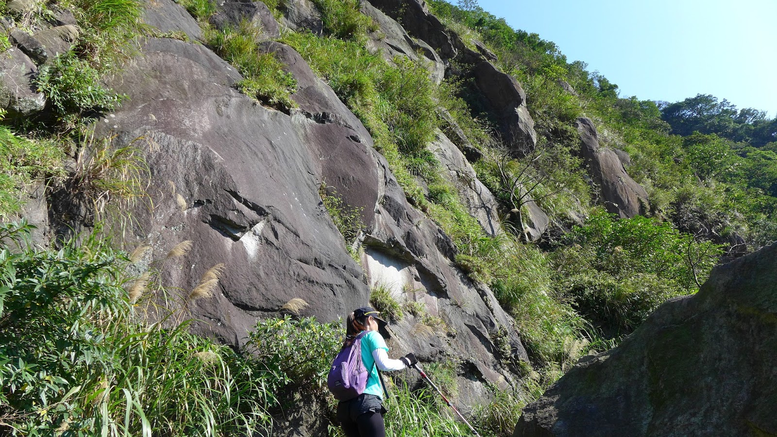 續行經過一處石壁區,從上鞍部的登山口話路徑就在上方,前半段2條路線幾乎是水平前進。