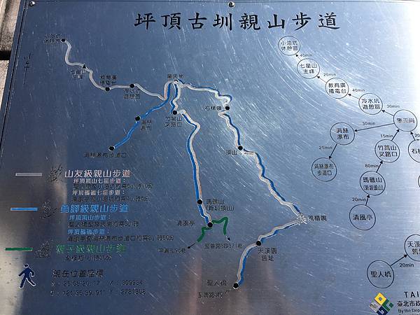 風櫃嘴步道口的地圖,今日到達登山口後,將途經頂山、柳杉林、石梯嶺,最後到擎天崗遊客中心下山。