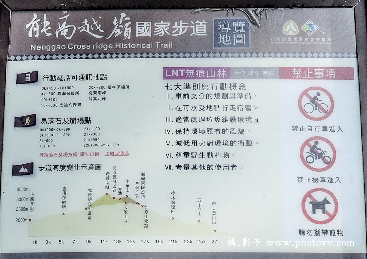 ↓07:30整裝準備後,就由海拔高度:2000m屯原登山口(能高越嶺古道)為起點行走13.5KM,估計約6小時內抵達天池山莊(實際花費:5hr45min)。由入口導覽圖中可看到步道中有幾處易落石的崩塌點,這也是文章中紀錄的重點,提供給後續有計畫前來的朋友們參考。