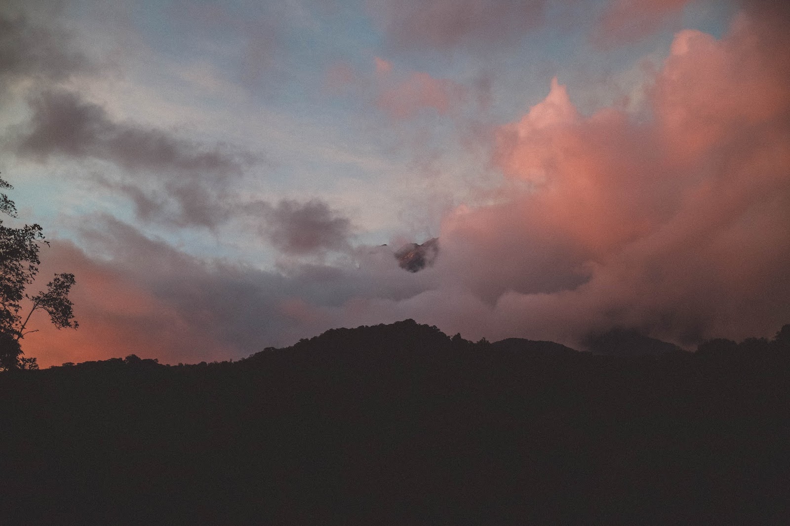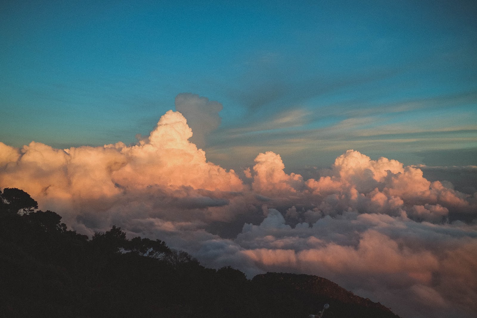 神山山頭從雲層中探出頭來,搭配著夕陽折射出的粉色雲朵