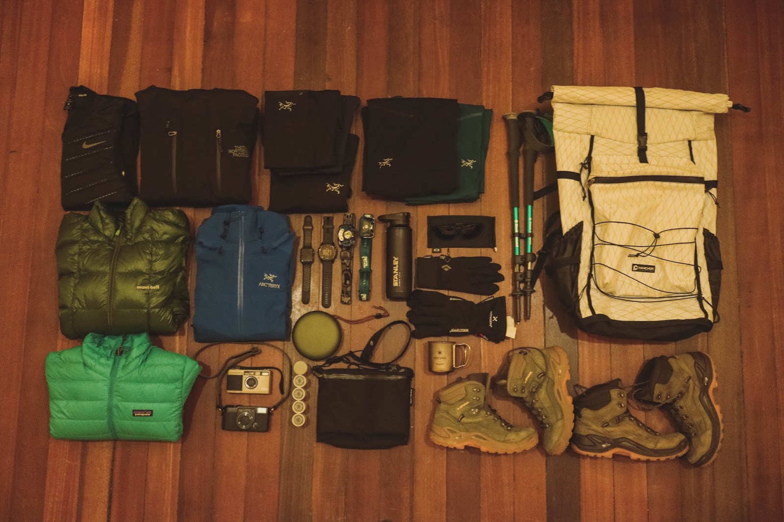 我把裝備攤開拍一張裝備照,我們2人用一個包包,
