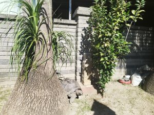 (鹿港)房厝(基石在謝厝巷3之3號民宅內。嘗試按門鈴無回應,於是在門口等了一段時間,終於看到從屋子出來要到庭院的女主人,說明來由後帶我進入)