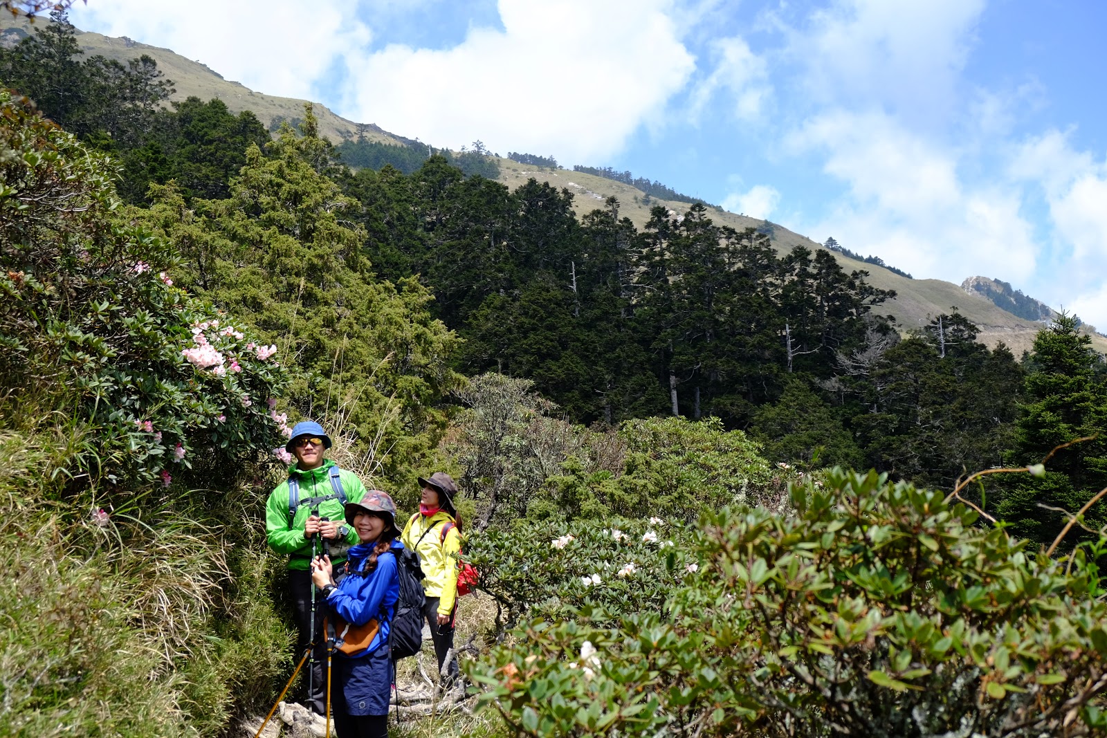 ↑出森林後有一小段寬闊的山景,路旁終於有幾叢忍不住先開跑的高山杜鵑
