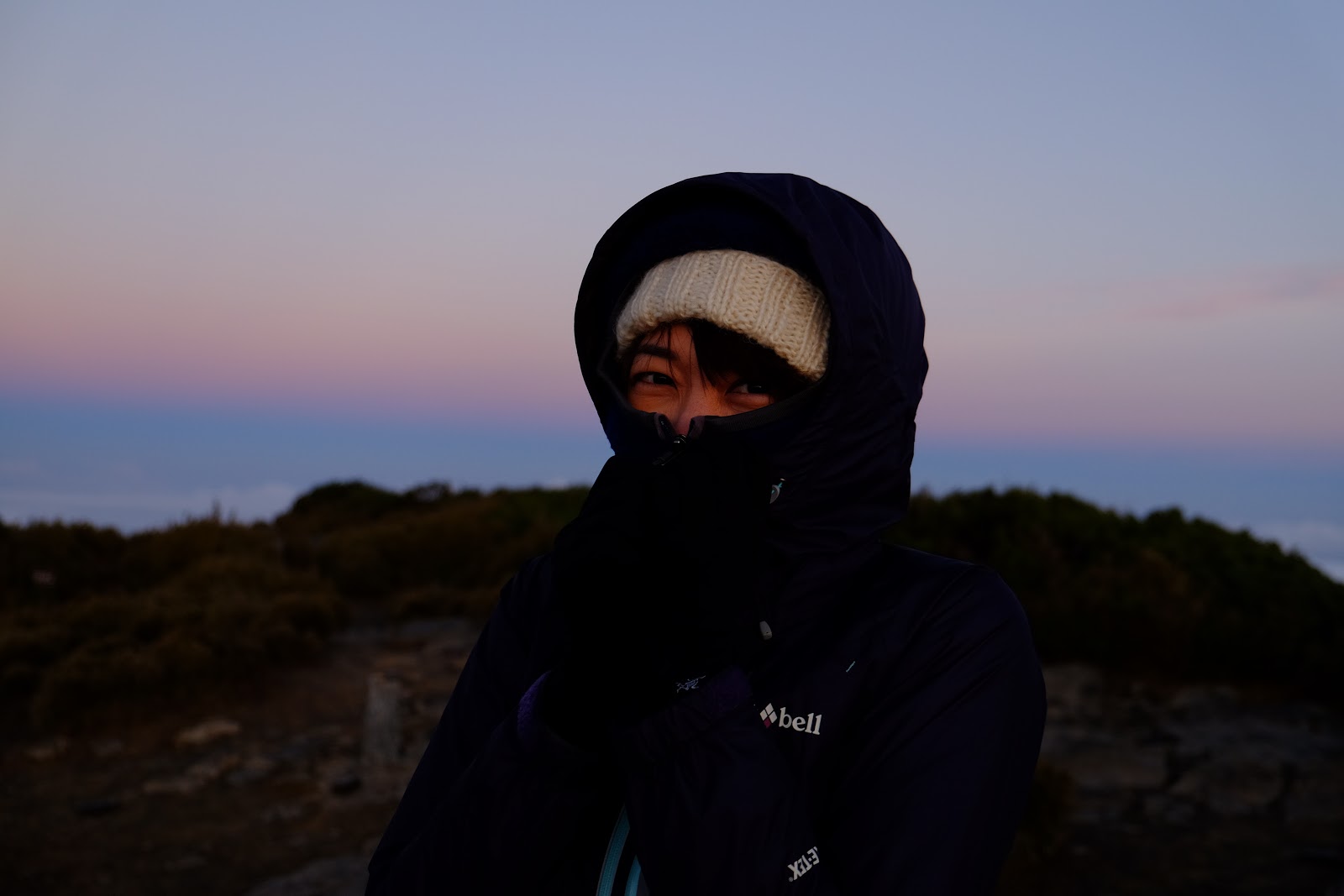 一路上沒有停歇的雨,May以一種堅定的語氣表達無比堅毅的意志:到山頂太陽就會為我而升起,於是我們馬不停蹄的衝向合歡山東峰。時間6點半氣溫5度,在松雪樓停車場都還看不見松雪樓,這樣程度的濃霧,我們還是上了!