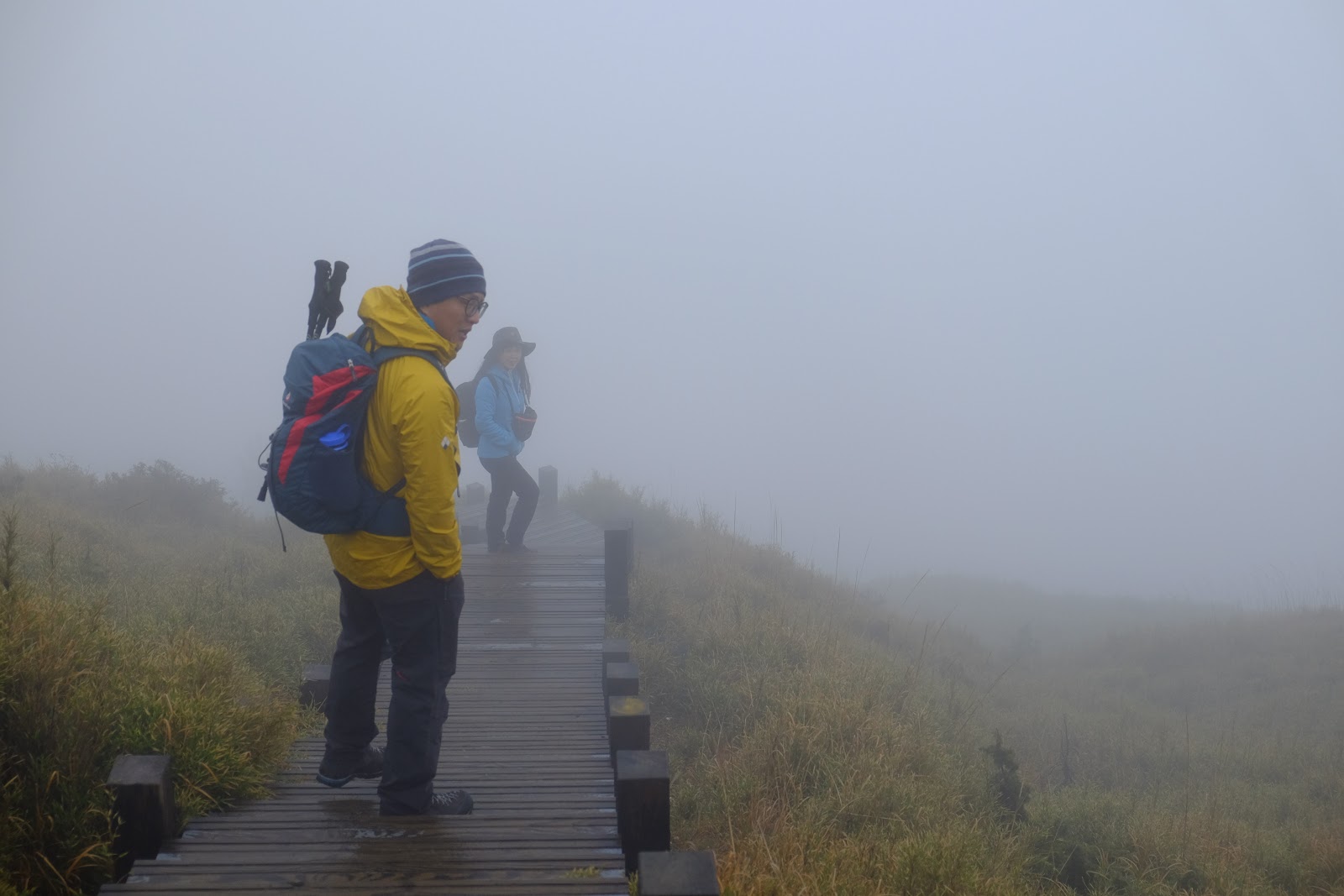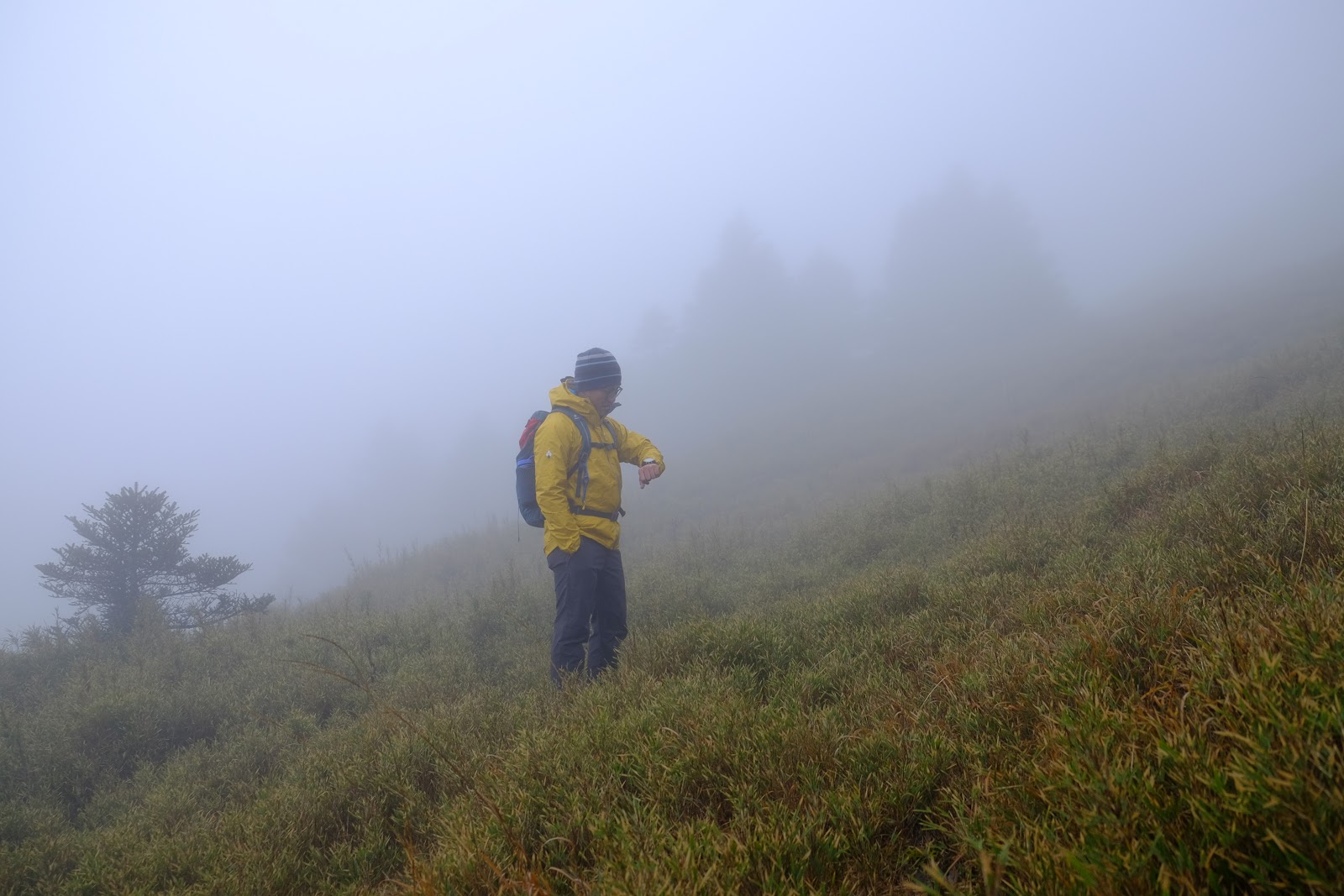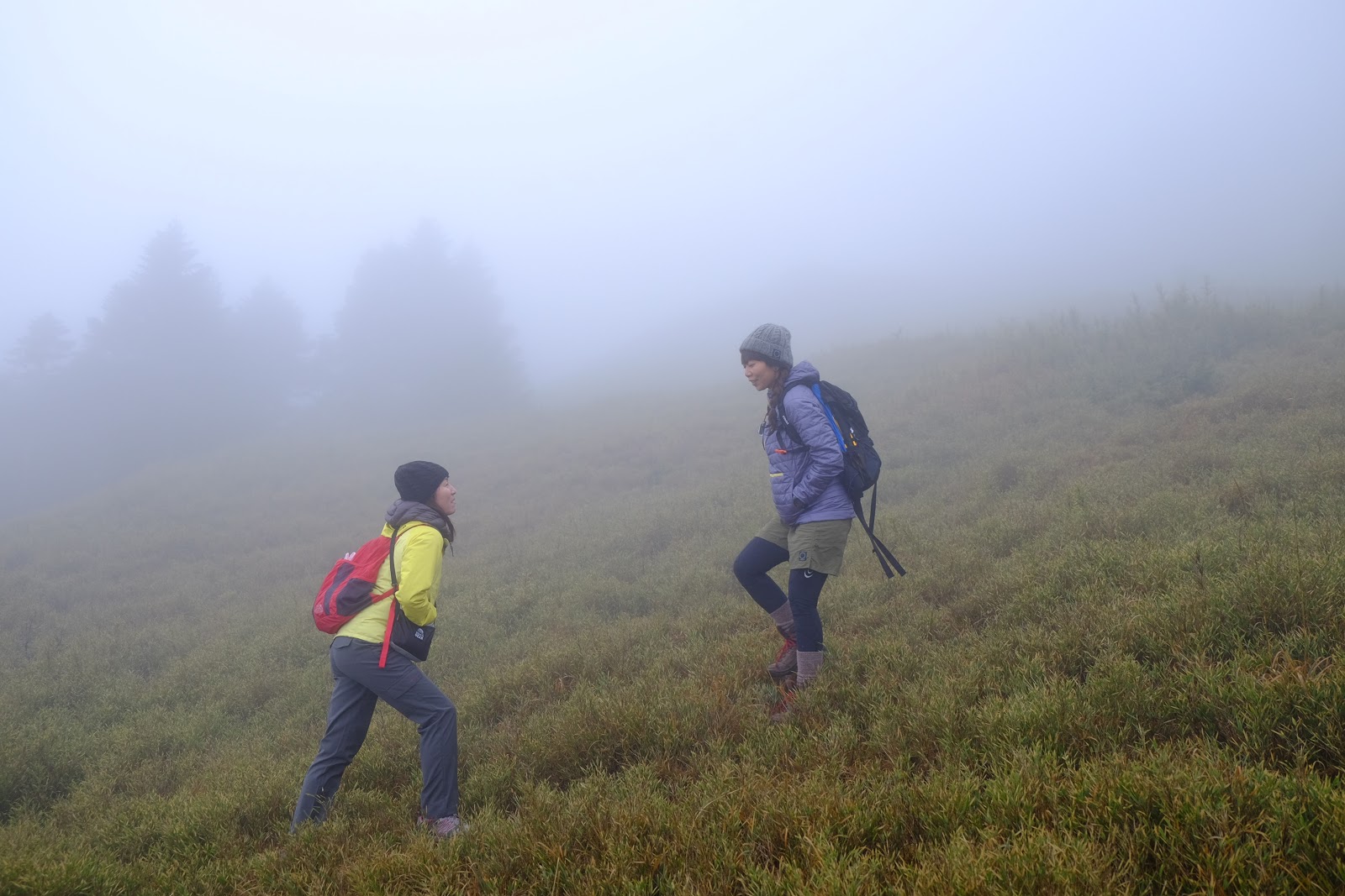 此時剛好遇到救難隊整裝往奇萊出發進行八天七夜的訓練,特意挑選這樣的天氣是因為大多時候遇到需要救援時都是這樣的濃霧雨日,花蓮救難隊的大哥頻頻叮嚀我們不要再往前走,甚至到小奇萊他都不建議。我們當然是乖巧的好山友,目送英雄們出發以後便回頭,一日臺北合歡的行程。