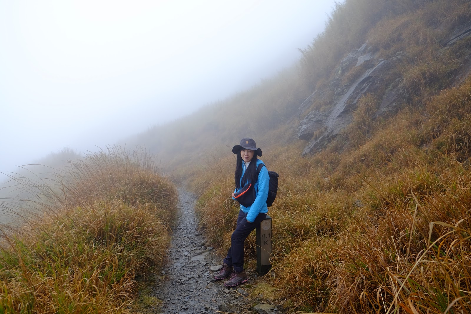隔日凌晨兩點起床出發合歡北峰準備觀日出,大霧瀰漫加上強勁的寒風,包的緊緊的我開始有不舒服的反應,頭痛欲裂又趕日出的時間,一路悶著頭直走到1.2K處,才放鬆心情的回頭想要跟大家說反射板到了。 但左張右望都沒有看到巨大的反射板,一時間心臟緊縮、砰動的聲音連耳朵都聽得見:我該不會在合歡北迷路了吧!原來是濃霧未散,反射板連走近了都還沒有辦法分辨,此時更擔心的是會不會沒有辦法讓好友感受到第一次的高山日出美景。