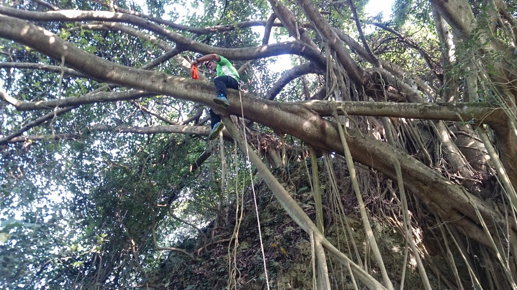 首先,教練先表演一段跟猴子一樣的靈敏度,爬上了一顆至少五米高以上的大樹,